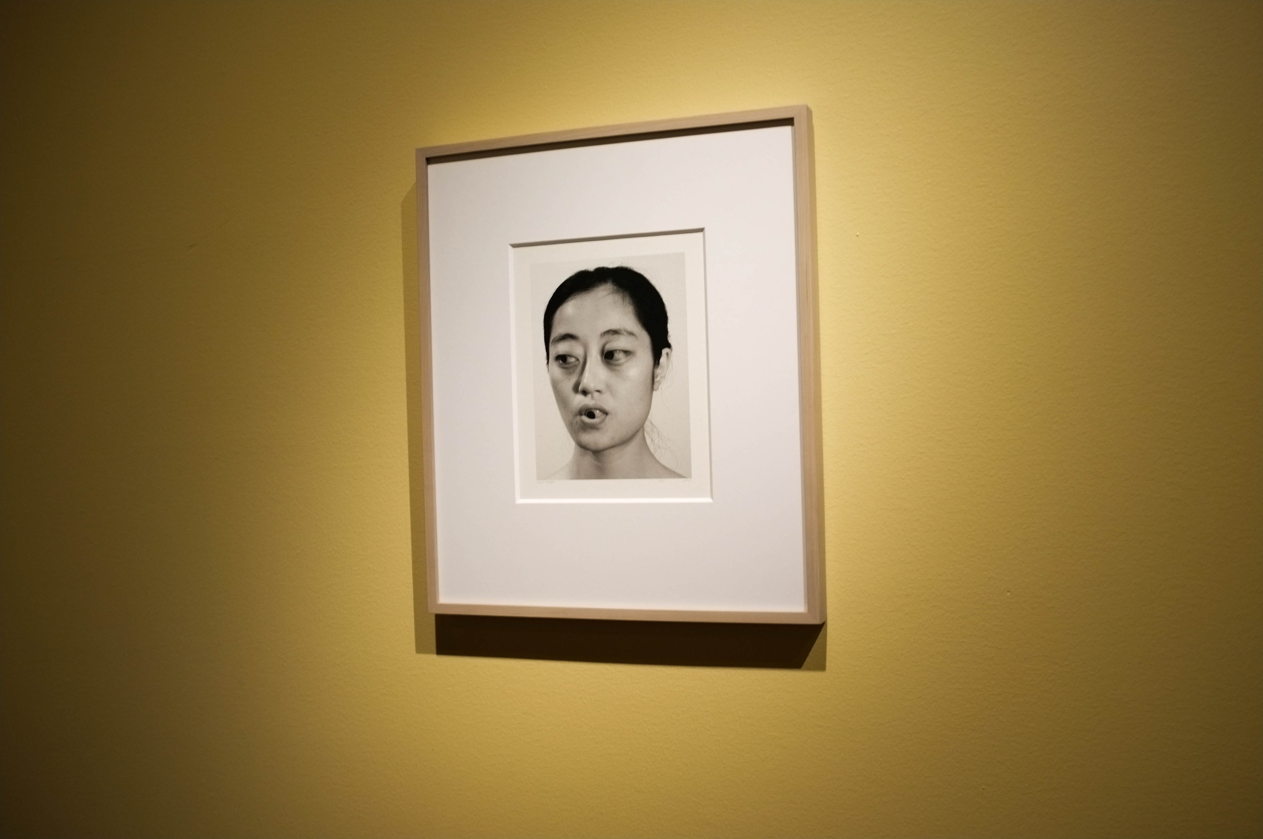 This striking portrait showcases a young woman mid-expression, captured in fine detail against a warm yellow wall. The composition invites the viewer to connect with her subtle emotions, while the soft lighting enhances the serene yet contemplative mood. The stark contrast between the subject and the background draws attention to her nuanced facial features, emphasizing the artistic interplay of shadow and light.