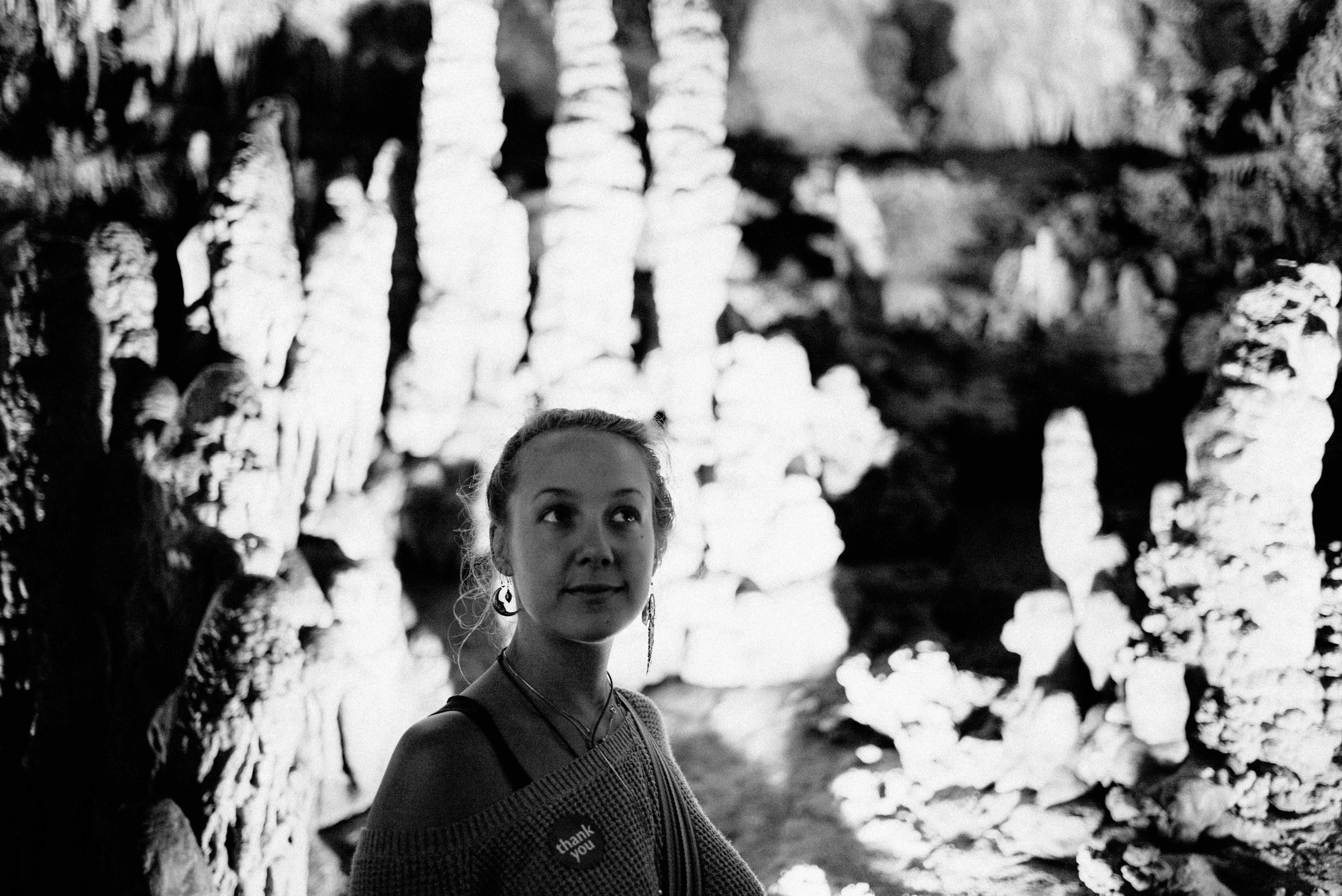In a dimly lit cavern, a young woman gazes upward, her expression a blend of curiosity and wonder. The ethereal formations around her, illuminated softly, contrast with the deep shadows, creating a mystical atmosphere that evokes a sense of adventure and discovery. The monochrome palette enhances the dramatic interplay of light and dark, drawing the viewer's eye to both the subject and the enchanting surroundings.