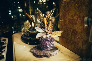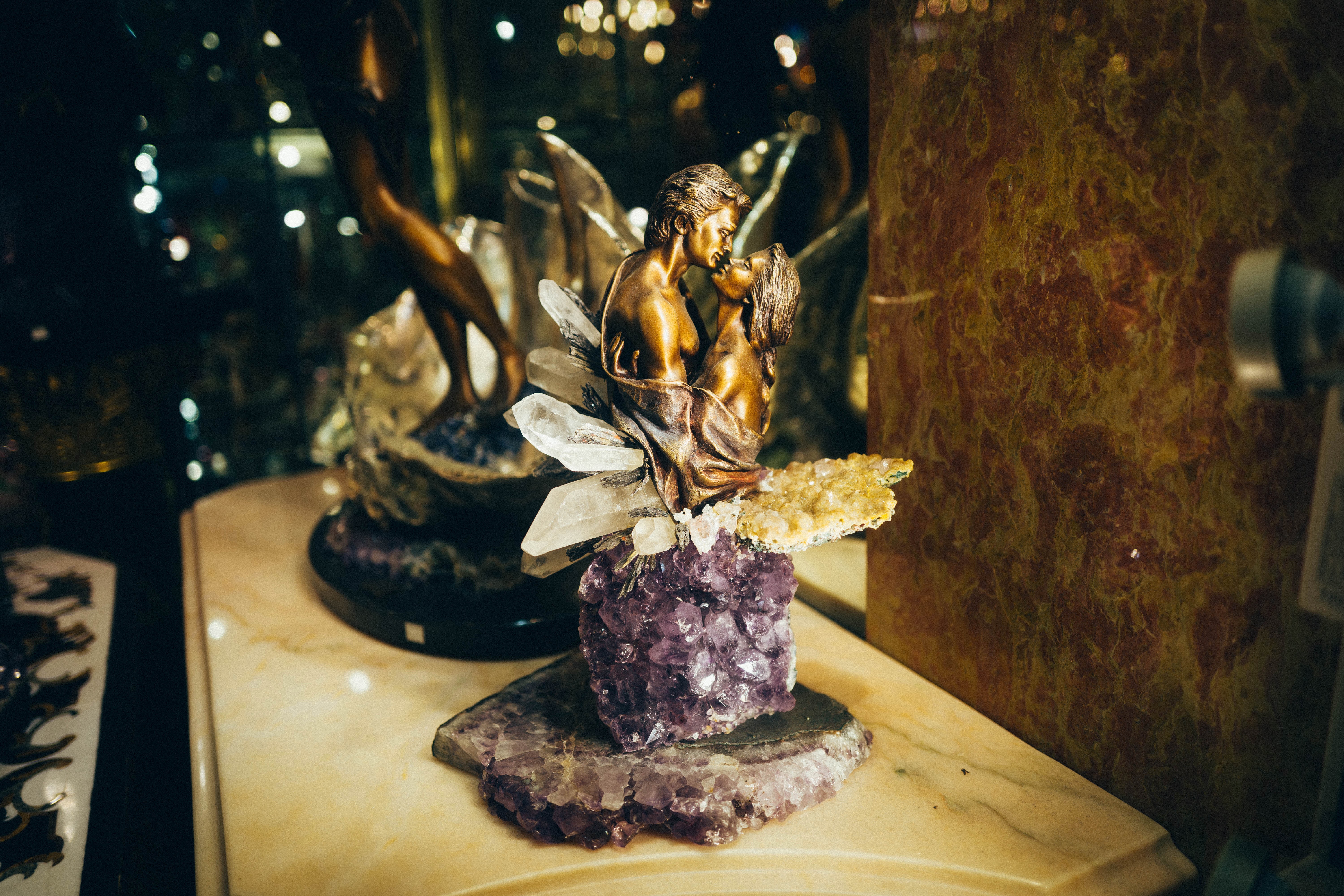 This captivating sculpture depicts a tender moment between two figures, entwined in an affectionate kiss. The warm tones of the bronze contrast beautifully with the surrounding amethyst and clear quartz, creating a mood of intimacy and romance. Soft, focused lighting highlights the intricate details of the figures, drawing the eye to their expressions and the exquisite craftsmanship of the piece.