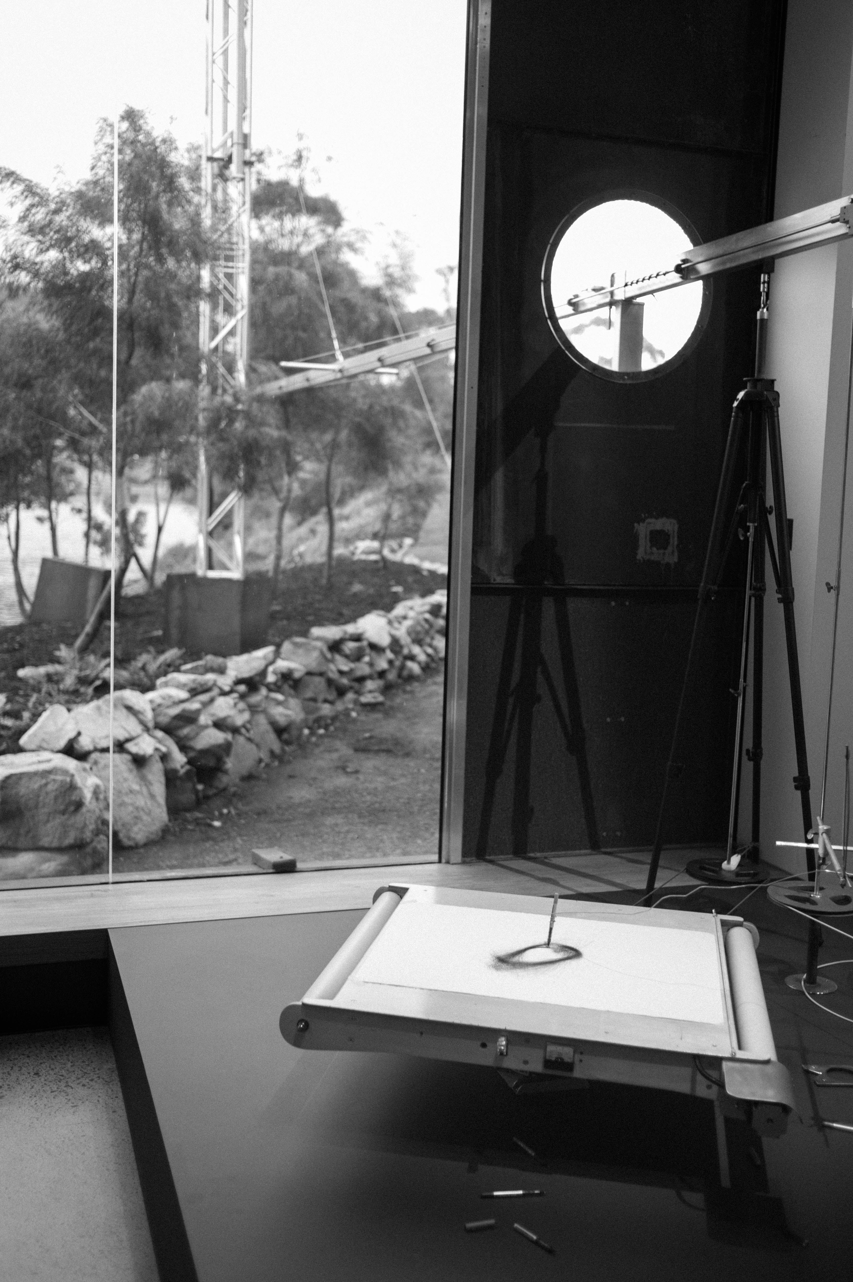 This monochromatic photograph captures an intimate scene inside a modern space, with a circular window framing a glimpse of nature beyond. The minimalist composition highlights a drawing apparatus, evoking a sense of creativity and contemplation. Soft, diffused light illuminates the interior, enhancing the serene mood and inviting exploration of the connection between the artist's space and the external landscape.