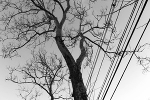 A stark, bare tree rises against a pale sky, its twisted branches reaching outward in an intricate, skeletal pattern. Power lines crisscross the scene, contrasting the natural form with man-made elements, enhancing the mood of isolation and introspection. The black-and-white composition evokes a sense of melancholy, capturing a moment where nature and urban life intertwine.