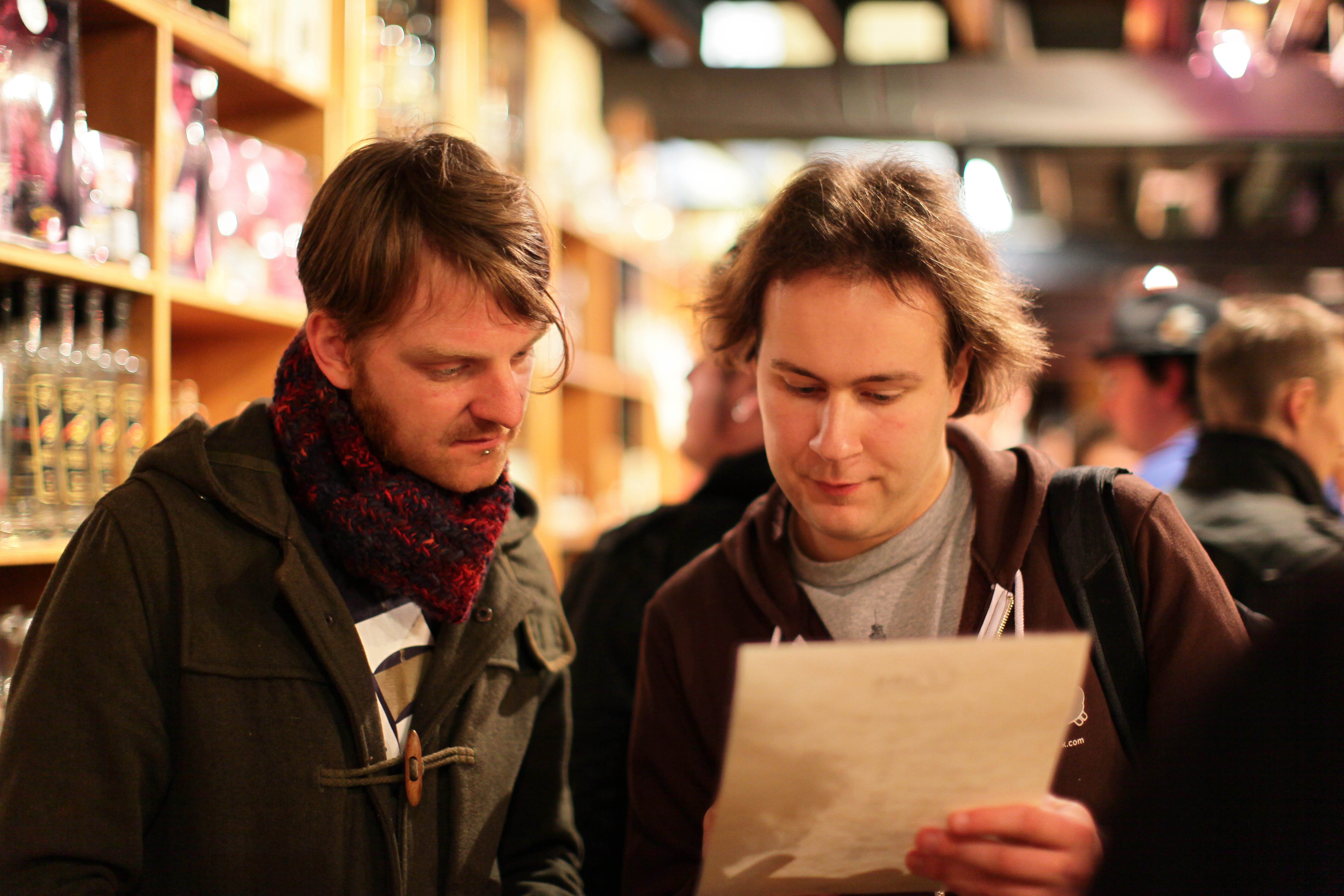 Two men engage in a focused discussion as they examine a piece of paper in a warmly lit store filled with shelves of bottles. The intimate atmosphere is enhanced by the soft, ambient lighting, creating a sense of camaraderie and curiosity. Their expressions convey a blend of intrigue and deliberation, adding to the overall inviting mood of the scene.