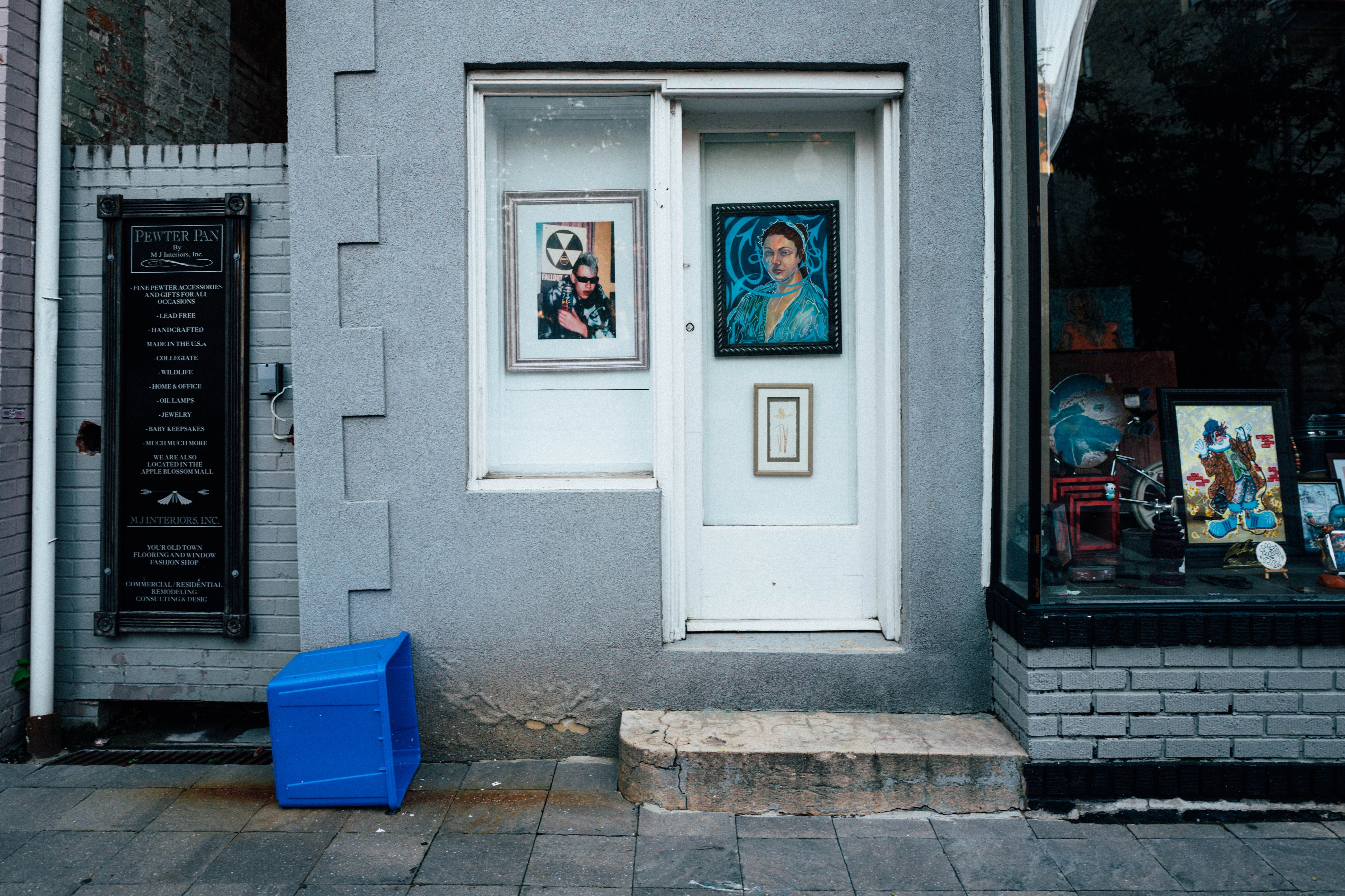 The photograph captures an intriguing storefront featuring framed portraits that draw the eye against a muted gray wall. A vibrant blue crate adds a pop of color, enhancing the urban, eclectic ambiance of the scene. Soft light illuminates the space, creating a calm yet contemplative mood, inviting viewers to reflect on the art displayed within.