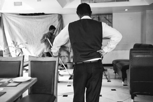 In a monochrome setting, a figure in a vest stands pensively with hands on his hips, observing the activity around him. The composition captures a moment of reflection amidst the bustle of a restaurant preparation, with subdued lighting adding a sense of introspection to the scene. The contrast of the empty chairs and busy workers hints at the transition from calm to chaos, evoking a mood of anticipation.