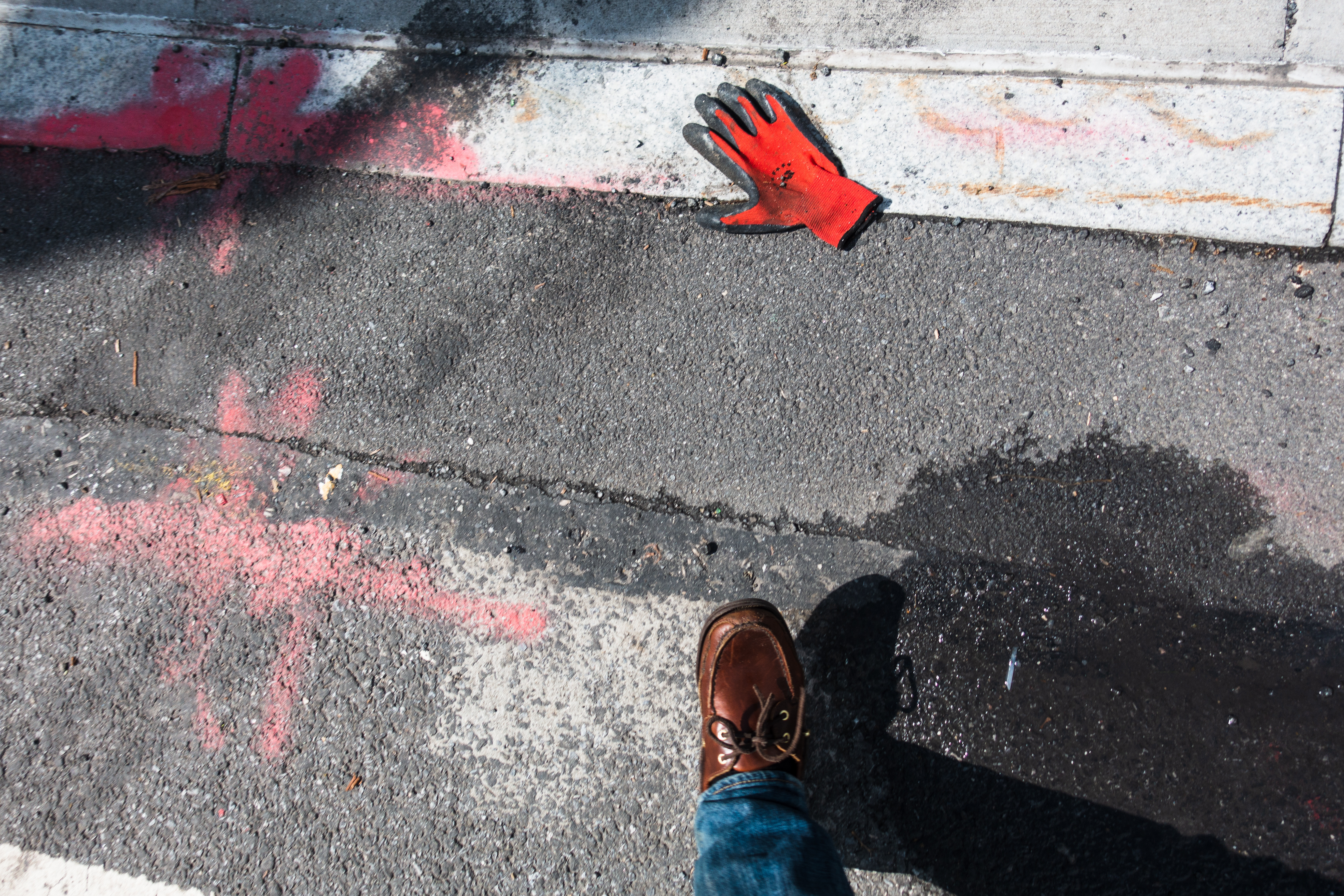 A close-up view captures a vibrant red glove abandoned on a gray pavement, contrasting sharply with the dull asphalt beneath. The shoe of an unseen figure inches close, hinting at movement and the passage of time. Sunlight bathes the scene, casting shadows that evoke a sense of solitude and forgotten stories.