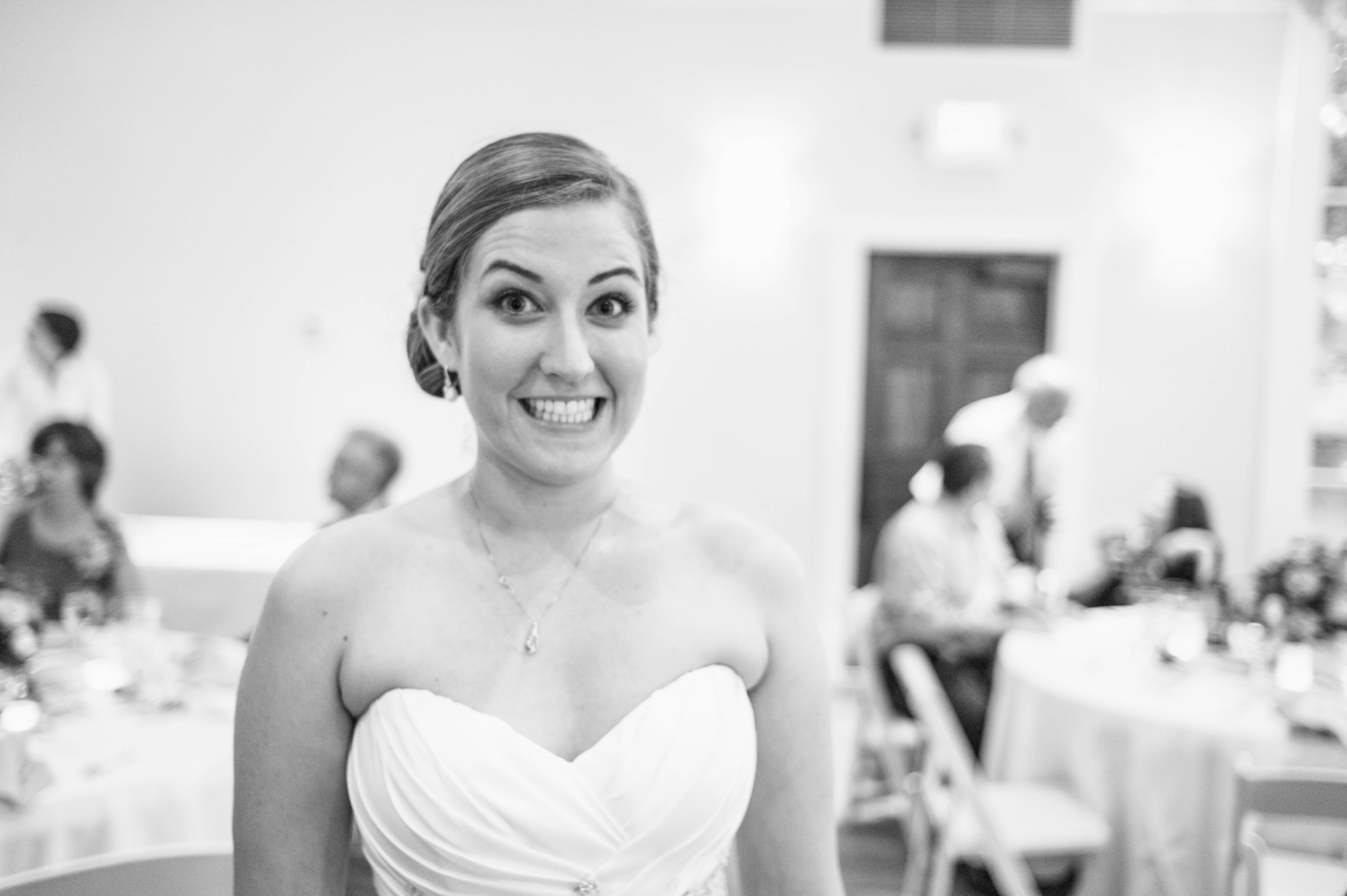 In this lively black-and-white photograph, a bride beams with delight, her broad smile radiating happiness against the backdrop of a bustling reception. The soft lighting casts a warm glow, highlighting the joyous atmosphere as friends and family gather around elegantly set tables, reflecting the moment's celebration. The composition draws the eye to her joyful expression, encapsulating the spirit of love and togetherness on a special day.