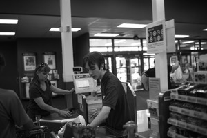 In this monochromatic scene, a young cashier is deeply focused on processing items at the register, while a customer waits attentively beside him. The stark lighting and blurred background create a sense of intimacy and concentration, capturing a moment in the routine hustle of daily life. The composition subtly contrasts the bustling environment with the calm diligence of the workers, evoking feelings of ordinary yet essential interactions.