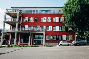 This striking photograph captures a vibrant red building adorned with a variety of artistic window displays, creating a lively contrast against the clear blue sky. The composition, framed by lush greenery and parked cars, evokes a sense of urban creativity and community spirit. The warm daylight illuminates the textures of the facade, enhancing the cheerful and inviting mood of the scene.