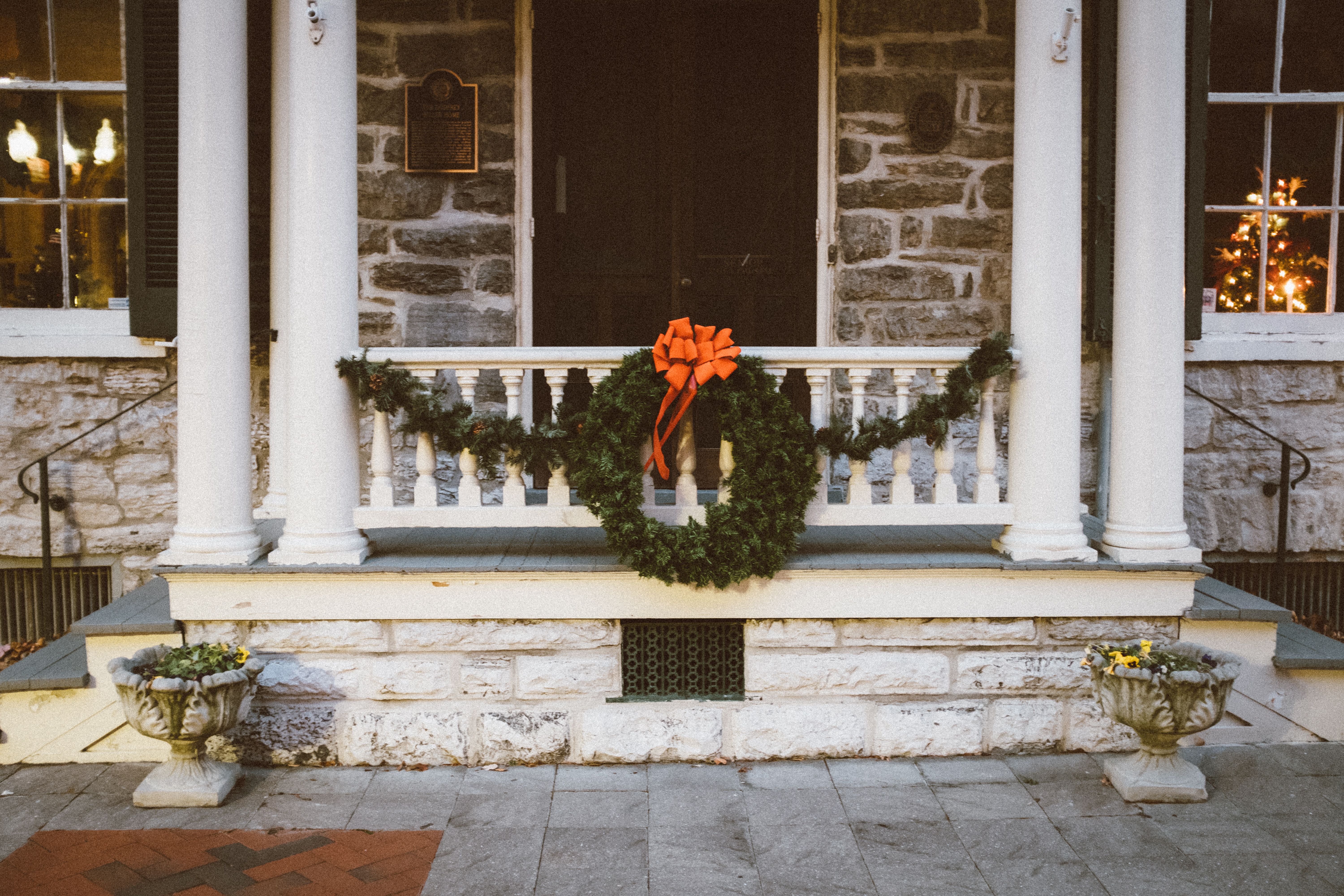 The photograph captures a beautifully adorned porch, featuring a lush green wreath topped with a vibrant red bow, setting a festive ambiance. Soft, warm lighting filters through the windows, illuminating the cozy interior, while the stone facade adds a rustic charm. The symmetrical composition draws the eye towards the inviting entrance, evoking a sense of holiday warmth and tradition.
