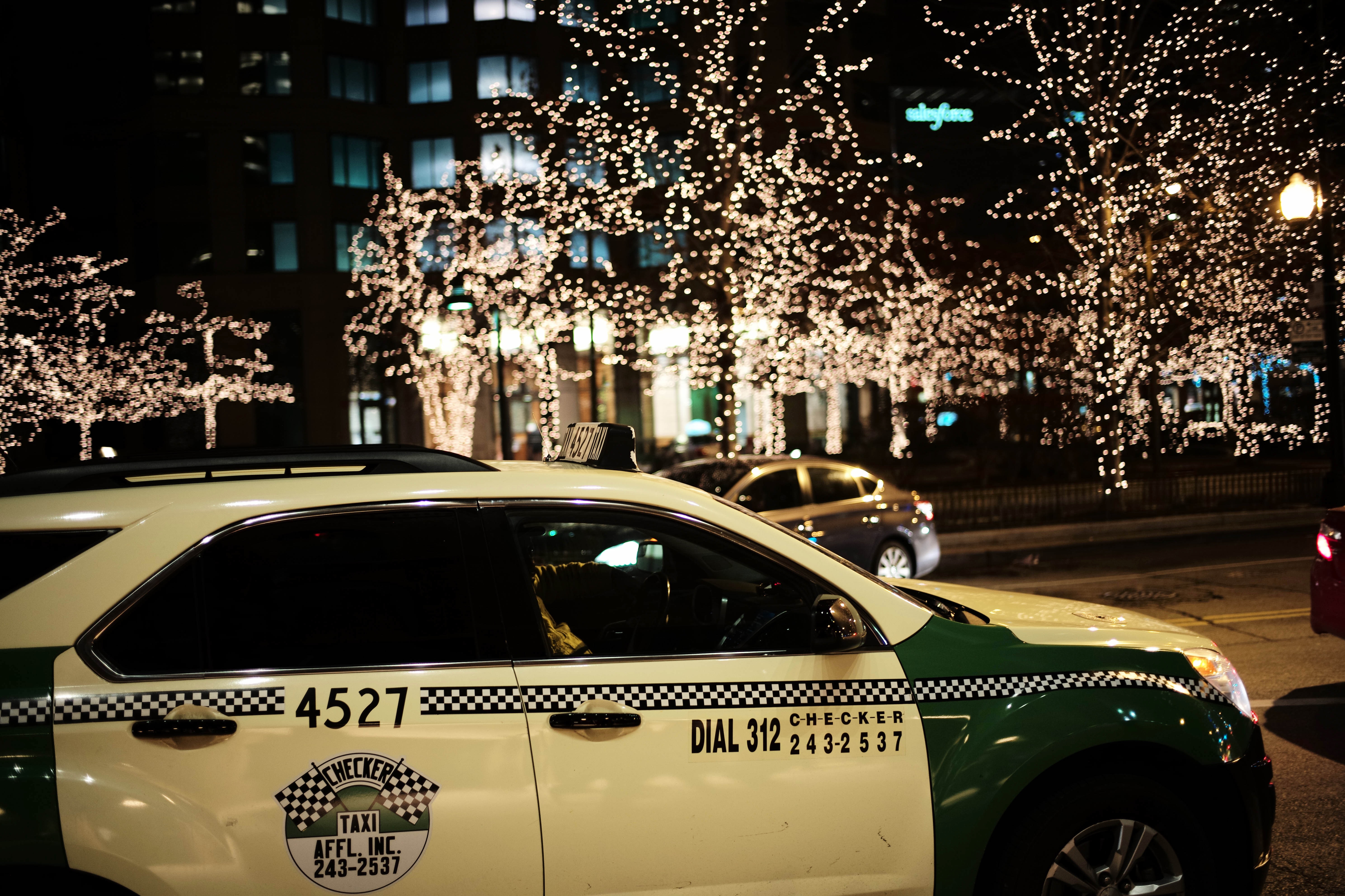 A vibrant taxi stands at the forefront, its green and white colors contrasting against the soft, warm glow of twinkling fairy lights that adorn nearby trees. The composition captures a sense of urban charm, blending everyday life with the enchanting ambiance of a night out. The subdued lighting creates a cozy atmosphere, inviting viewers to imagine the stories unfolding within this bustling cityscape.
