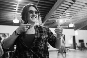 In this lively black-and-white portrait, a woman exudes playful confidence, playfully mimicking a gun gesture with her fingers while smiling. Soft overhead lighting accentuates her demeanor, creating an inviting atmosphere within a spacious, rustic interior. The composition captures her casual attire and the energetic vibe of the surrounding space, enhancing the sense of joy and spontaneity.