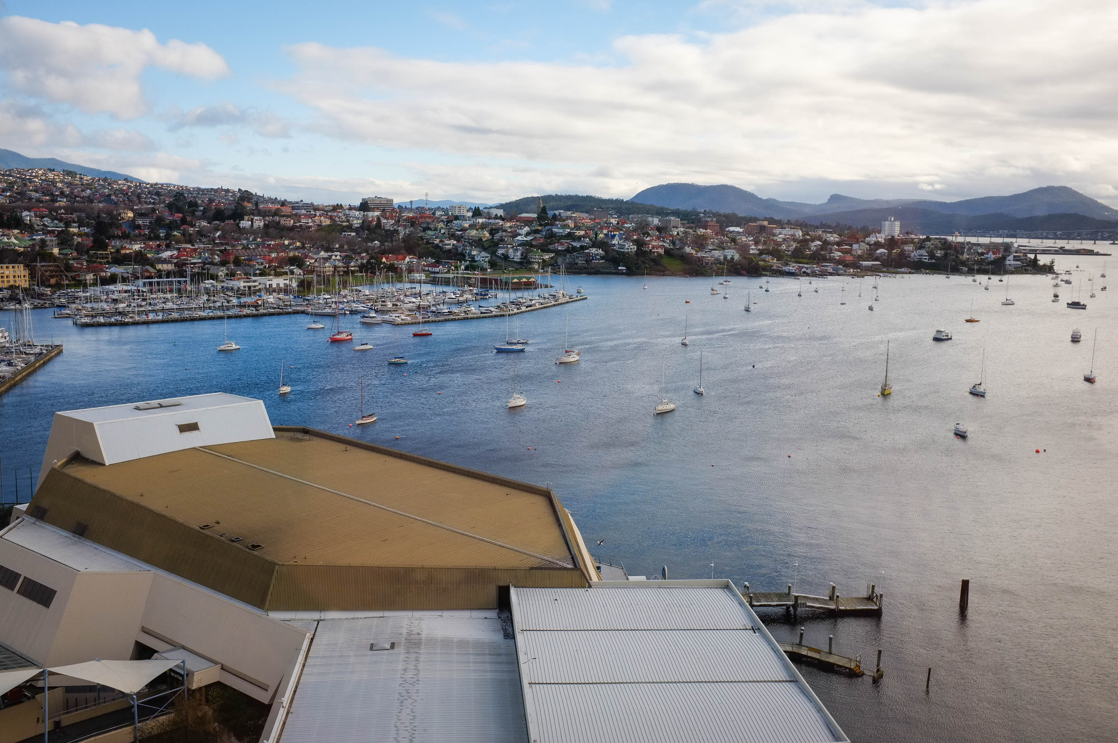 This photograph captures a tranquil waterfront scene, where calm waters mirror a patchwork of boats drifting gently. Soft clouds hover above, creating a serene atmosphere that blends with the distant hills, while modern architectural elements frame the composition, adding depth and interest. The overall mood is peaceful, inviting viewers to bask in the quiet beauty of the landscape.