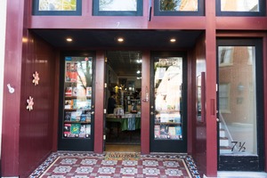 The photograph showcases the inviting entrance of a quaint bookstore, framed by rich red walls and floral decorations. Bright, natural light floods the doorway, illuminating the colorful book covers and creating a warm, welcoming atmosphere that beckons passersby to step inside and explore. The intricate tiled floor adds a touch of character, enhancing the cozy charm of this literary haven.