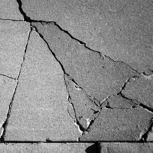 This monochromatic photograph captures the intricate patterns formed by cracks in a concrete surface, resembling an abstract map. The stark contrast between light and shadow highlights the rough texture, evoking a sense of age and neglect. The composition draws the eye into the fragmented lines, inviting reflection on the passage of time and wear.