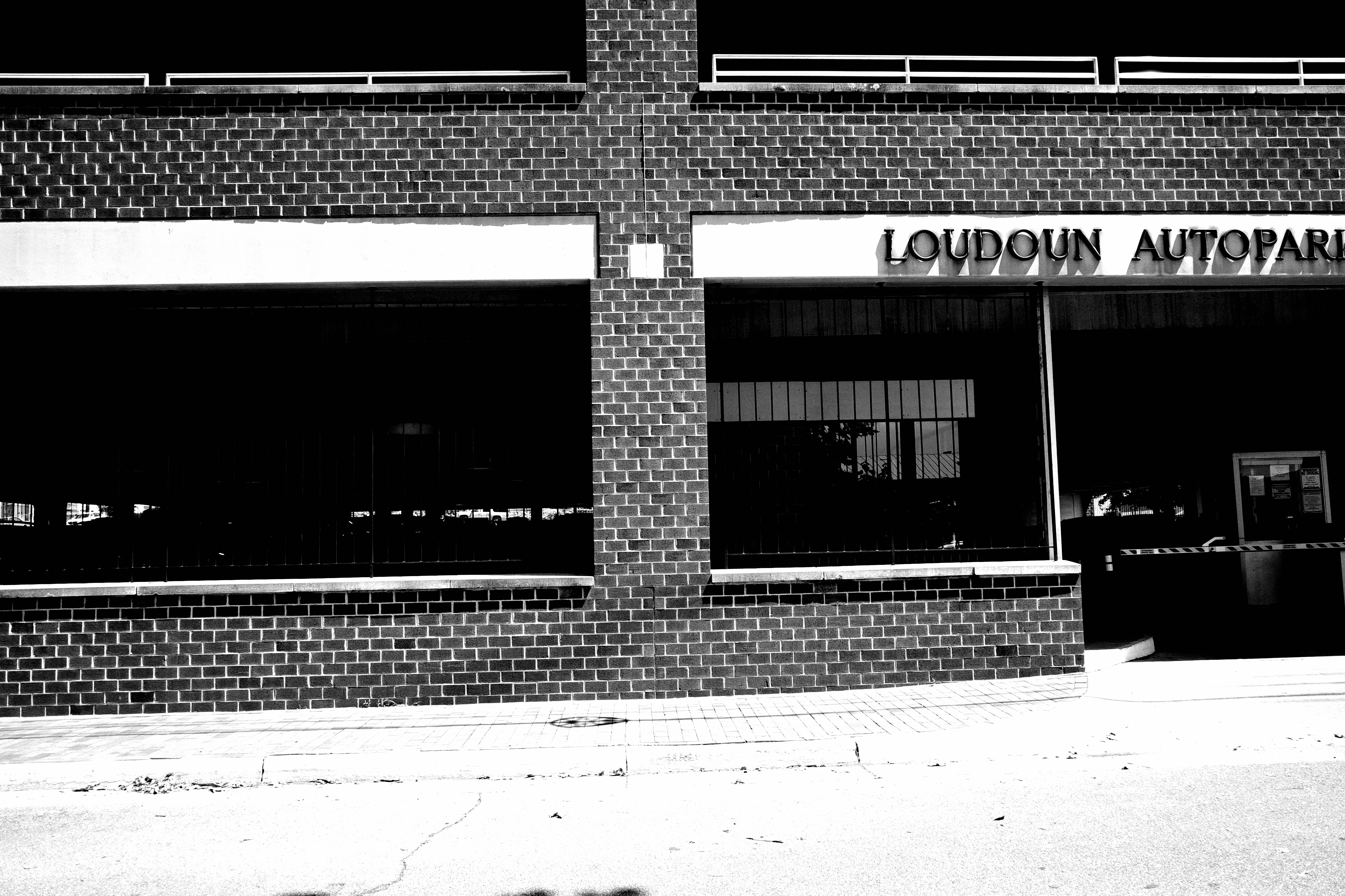 This monochrome photograph captures the facade of the Loudoun Autopark, characterized by its stark brickwork and empty spaces. The composition emphasizes the symmetrical lines and shadows, evoking a mood of quiet desolation and urban solitude. Harsh lighting enhances the dramatic contrasts, highlighting the architectural details and creating an atmosphere of abandonment.