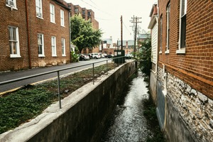 This photograph captures a quiet urban scene featuring a narrow, flowing stream bordered by brick buildings and a quiet street. The overcast sky casts a soft, muted light that accentuates the textures of the aged brick and the lush greenery. The composition draws the eye along the stream, creating a sense of calm amidst the surrounding city environment.