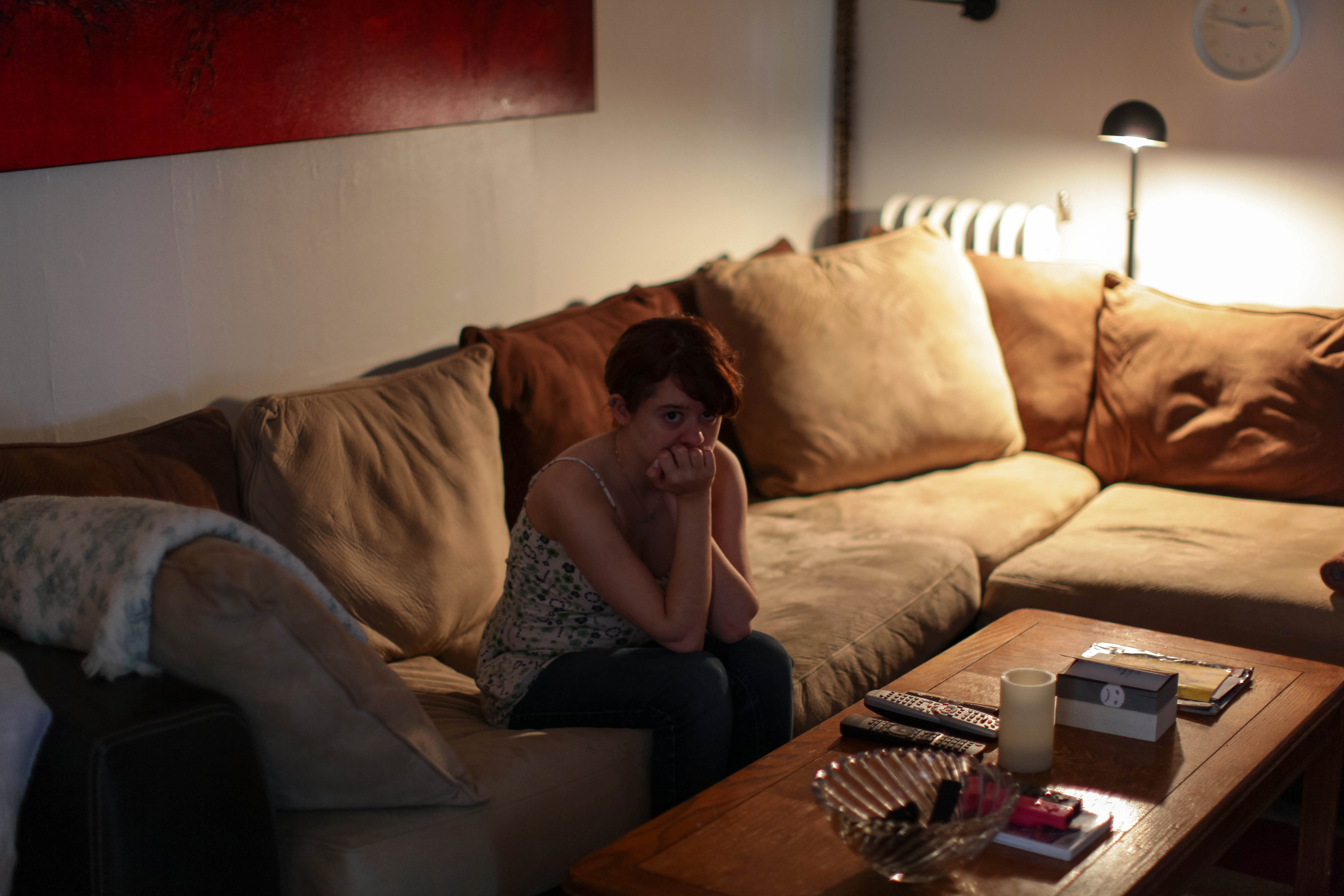 In a dimly lit living room, a young woman sits curled up on a soft, brown couch, her expression contemplative and anxious. The warm glow from a nearby lamp casts soft shadows, enhancing the intimate atmosphere while contrasting with the vibrant red artwork on the wall. The composition draws attention to her solitary figure, creating a mood of introspection and quiet tension.