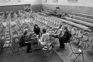In a stark, empty hall lined with folding chairs, a small group of five individuals sits closely together, engaged in deep conversation. The high-angle perspective emphasizes both the isolation of the surrounding empty seats and the intimacy of their discussion, illuminated by soft, diffused light that casts gentle shadows across the floor, enhancing the contemplative mood of the scene.