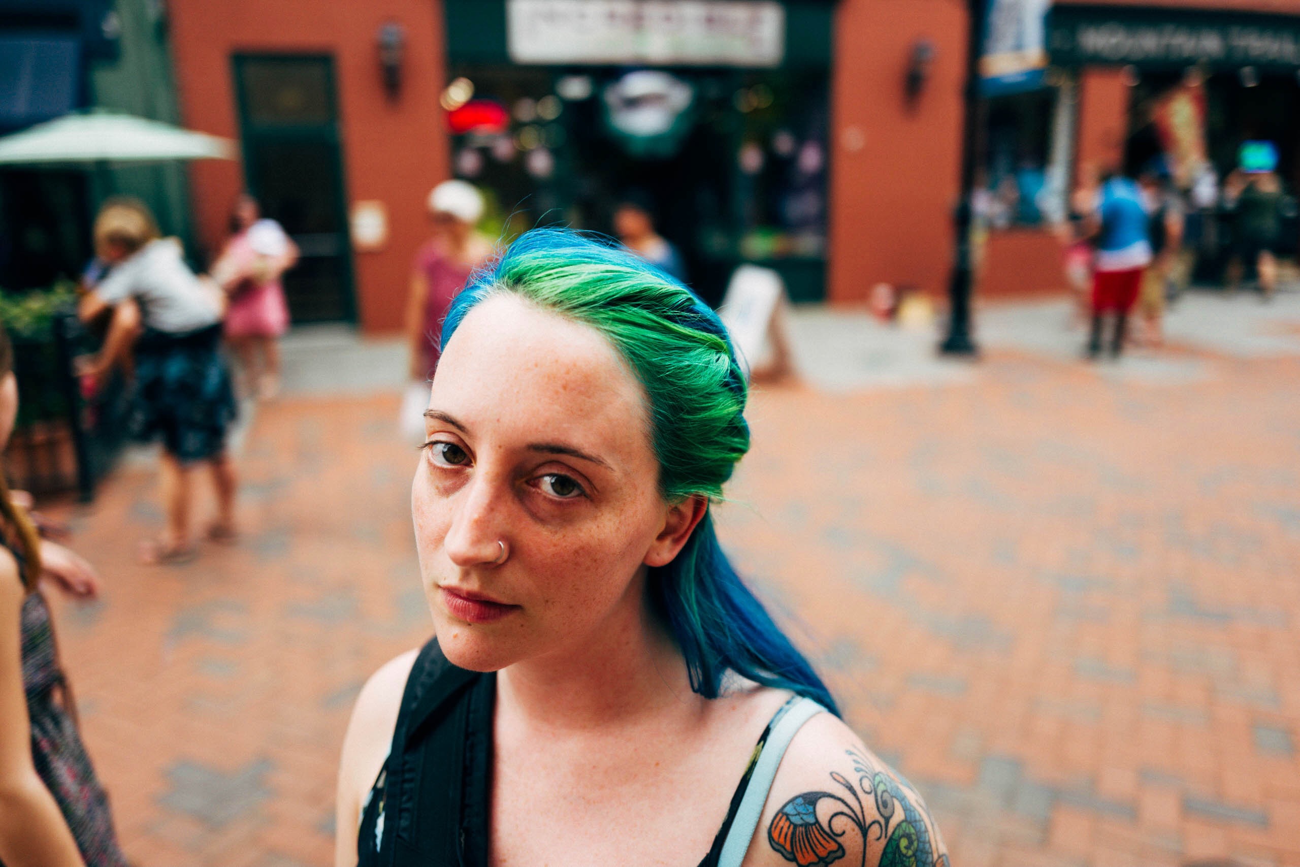This photograph captures a striking young woman with vibrant green and blue hair, standing against a bustling urban backdrop. The focus on her candid yet contemplative expression evokes a sense of individuality amidst the surrounding activity. Soft natural light highlights the details of her tattoos and the textures of her hair, creating a captivating contrast with the blurred figures in the background.