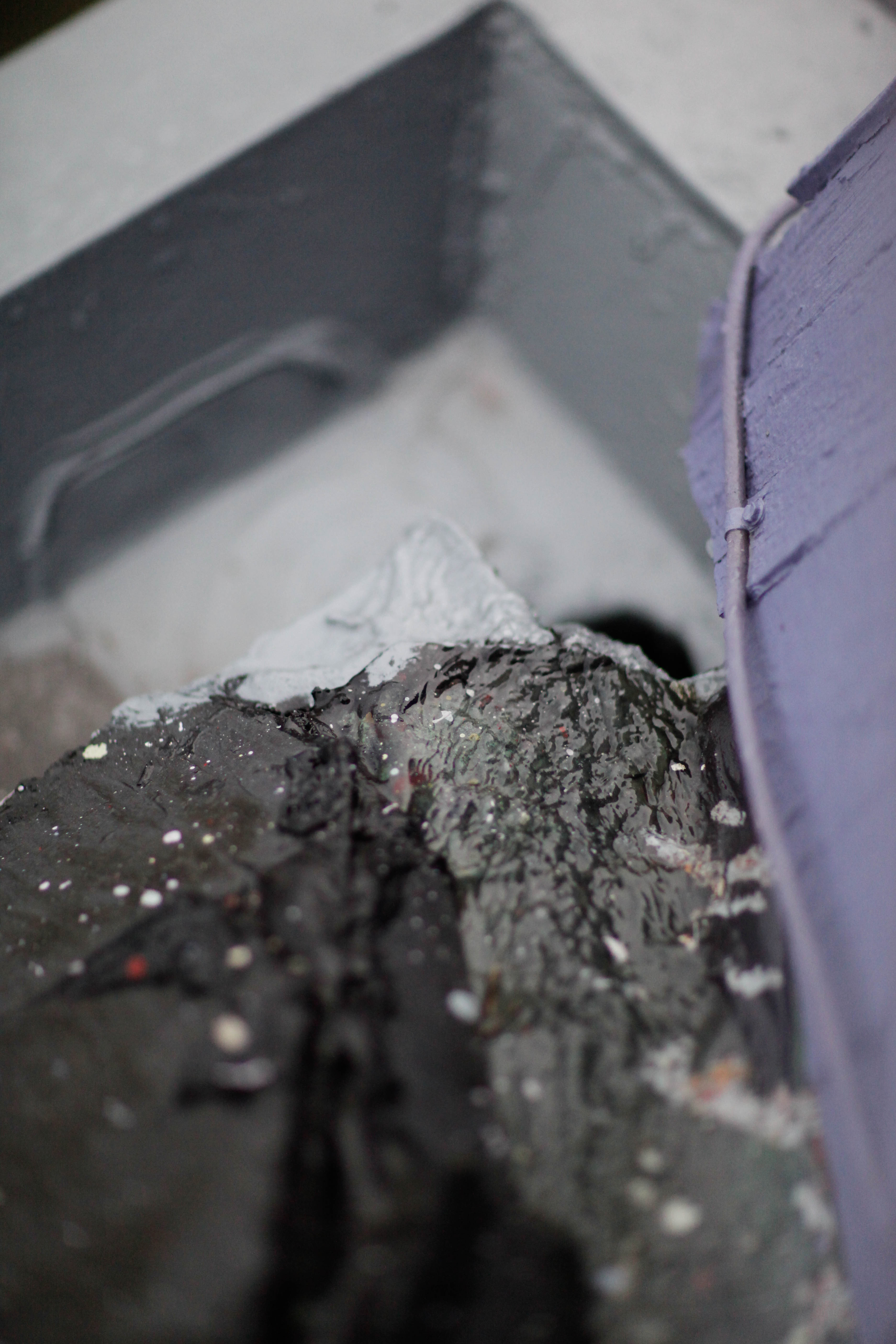 This photograph captures an intricate composition of textured surfaces, featuring a striking contrast between dark, rough rocks and smoother, lighter hues. The muted lighting and selective focus create a contemplative mood, inviting the viewer to explore the layers and shapes within the frame. Hints of color and detail emerge softly, enhancing the sense of depth and dimension.