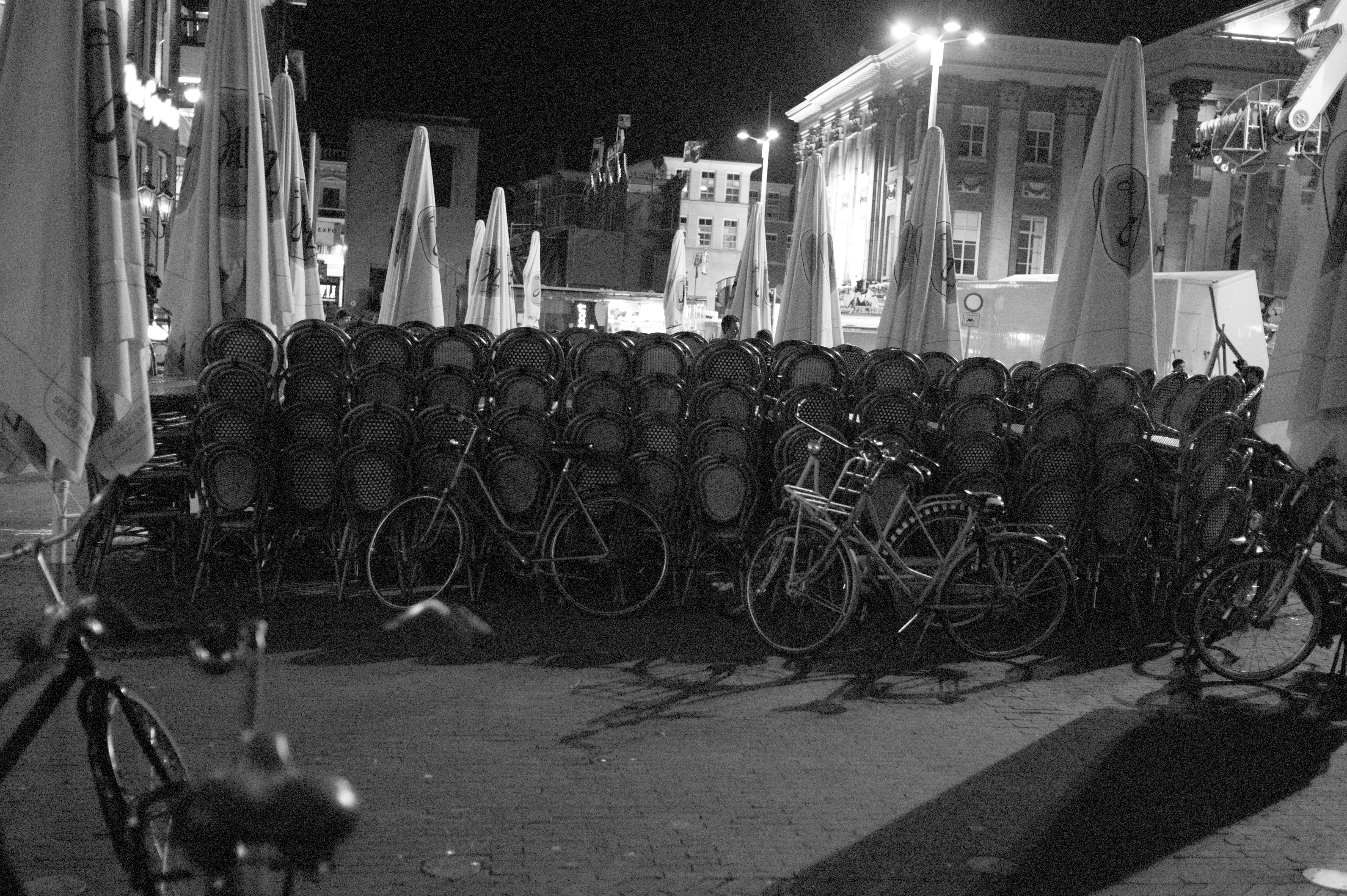 A somber night scene captures a stack of empty chairs lined against a dimly lit backdrop, their shadows stretching across the cobblestone ground. Several bicycles are haphazardly parked in the foreground, contributing to the sense of stillness and solitude. The cool tones and muted lighting evoke a quiet melancholy, suggesting an empty space once filled with life and warmth.