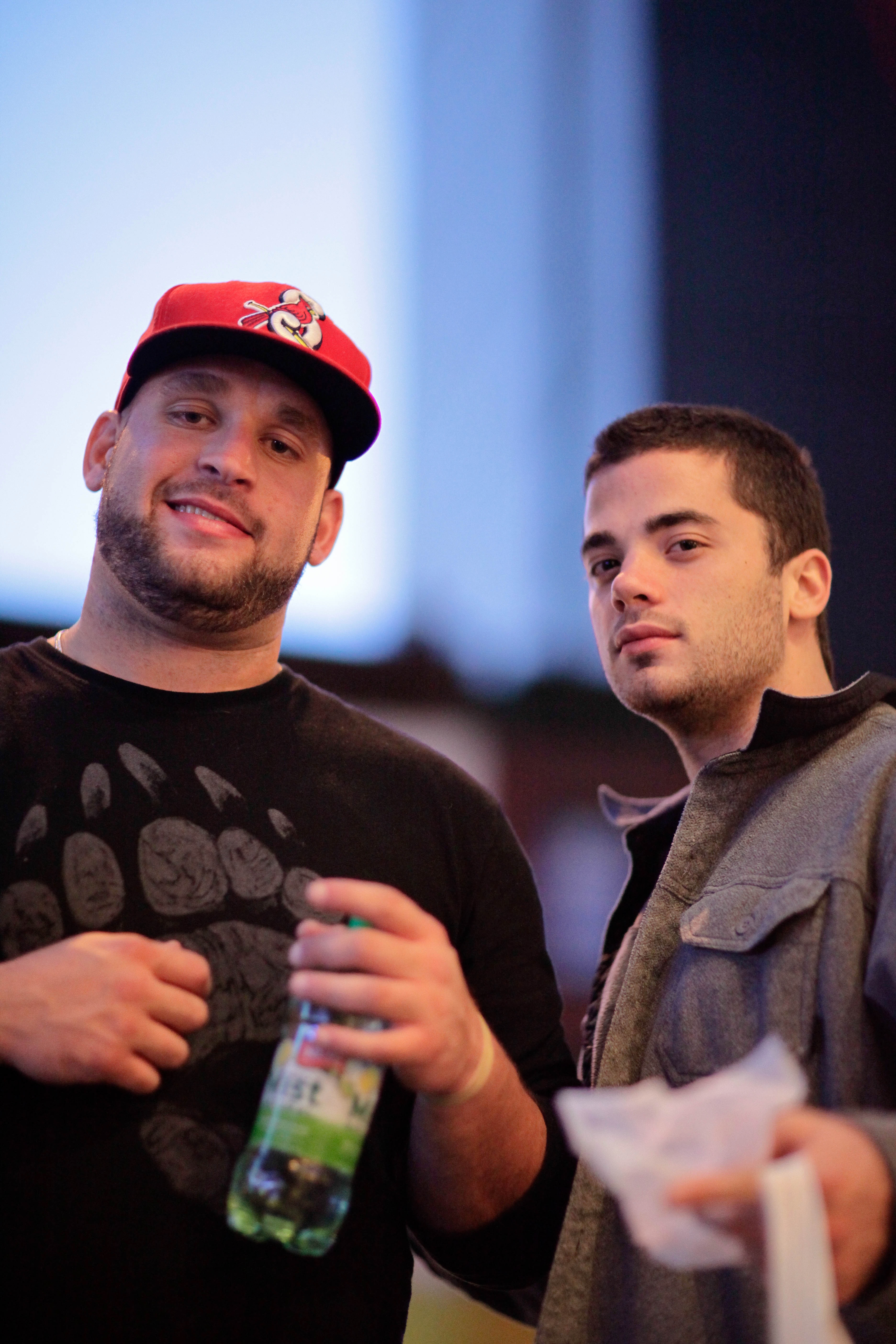 The photograph captures two young men standing together in an urban setting, exuding a relaxed yet confident vibe. The warm, diffused lighting highlights their casual attire, while the blurred background suggests a lively atmosphere. Their expressions, a mix of friendly smiles and thoughtful gazes, invite the viewer to share in a moment of camaraderie.