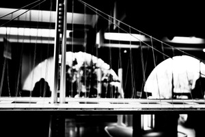 This striking black and white photograph captures a detailed model of a bridge, positioned prominently in the foreground. The blurred background adds depth, while the interplay of light and shadow creates a contemplative mood, evoking thoughts of connection and distance. The composition draws the eye to the intricate lines of the model, contrasting against the soft forms behind it, suggesting both fragility and strength.