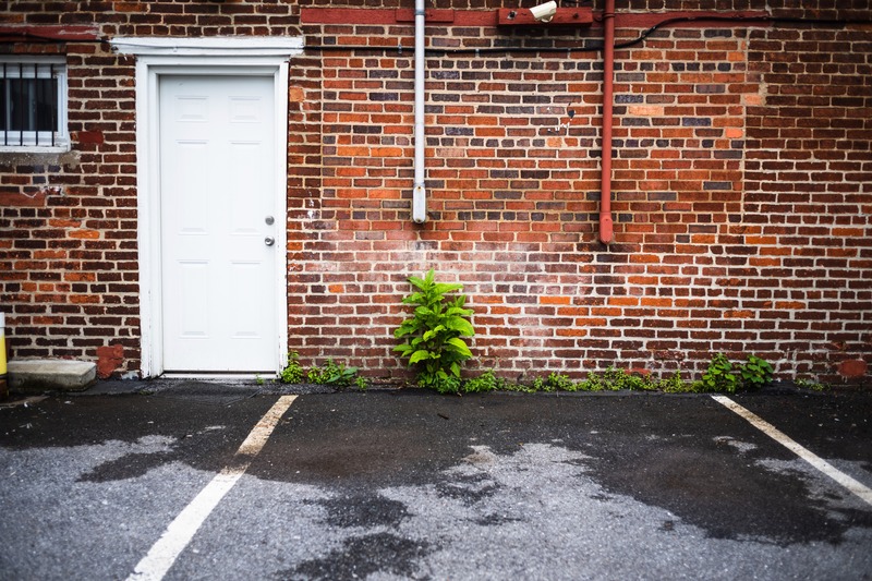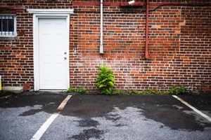 This photograph captures a stark contrast between a white door and a rustic brick wall, evoking a sense of solitude and forgotten spaces. A vibrant green plant emerges defiantly from the asphalt, symbolizing resilience amid neglect. Soft, diffused lighting adds a gentle mood to the scene, enhancing the textures of the brick and the glistening wet pavement.