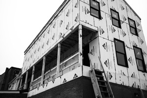 The photograph captures a stark, unfinished building wrapped in white sheathing, giving it a raw, industrial feel. The stark black and white contrast amplifies the mood of isolation and anticipation, with the empty windows gazing out into a foggy void. A wooden ladder leans against the facade, symbolizing both progress and the ongoing labor behind its creation.