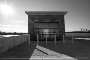 A stark, minimalist building stands prominently against a clear sky, bathed in bright sunlight that casts long shadows on the pavement. The monochrome palette heightens the sense of isolation and contemplation, evoking a feeling of stillness in a typically bustling environment. Geometric lines and the lone structure draw the eye inward, creating a striking contrast between man-made and natural elements.