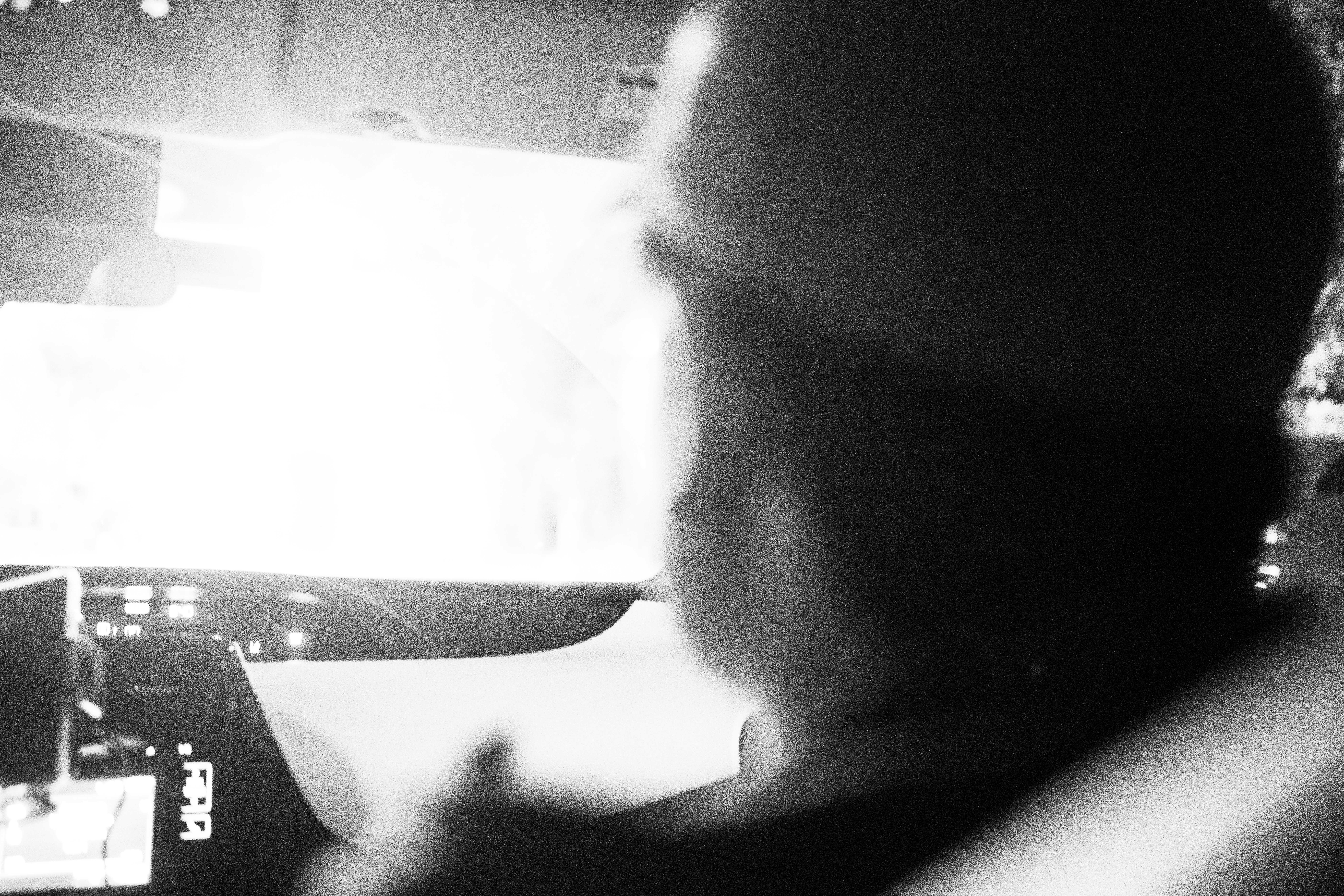 The photograph captures a candid moment inside a car, focusing on the blurred figure of a passenger. The stark contrast of light and shadow evokes a sense of mystery and urgency, while the intimate composition fosters a feeling of confinement and contemplation. The monochromatic tones add a timeless quality, enhancing the emotional depth of the scene.