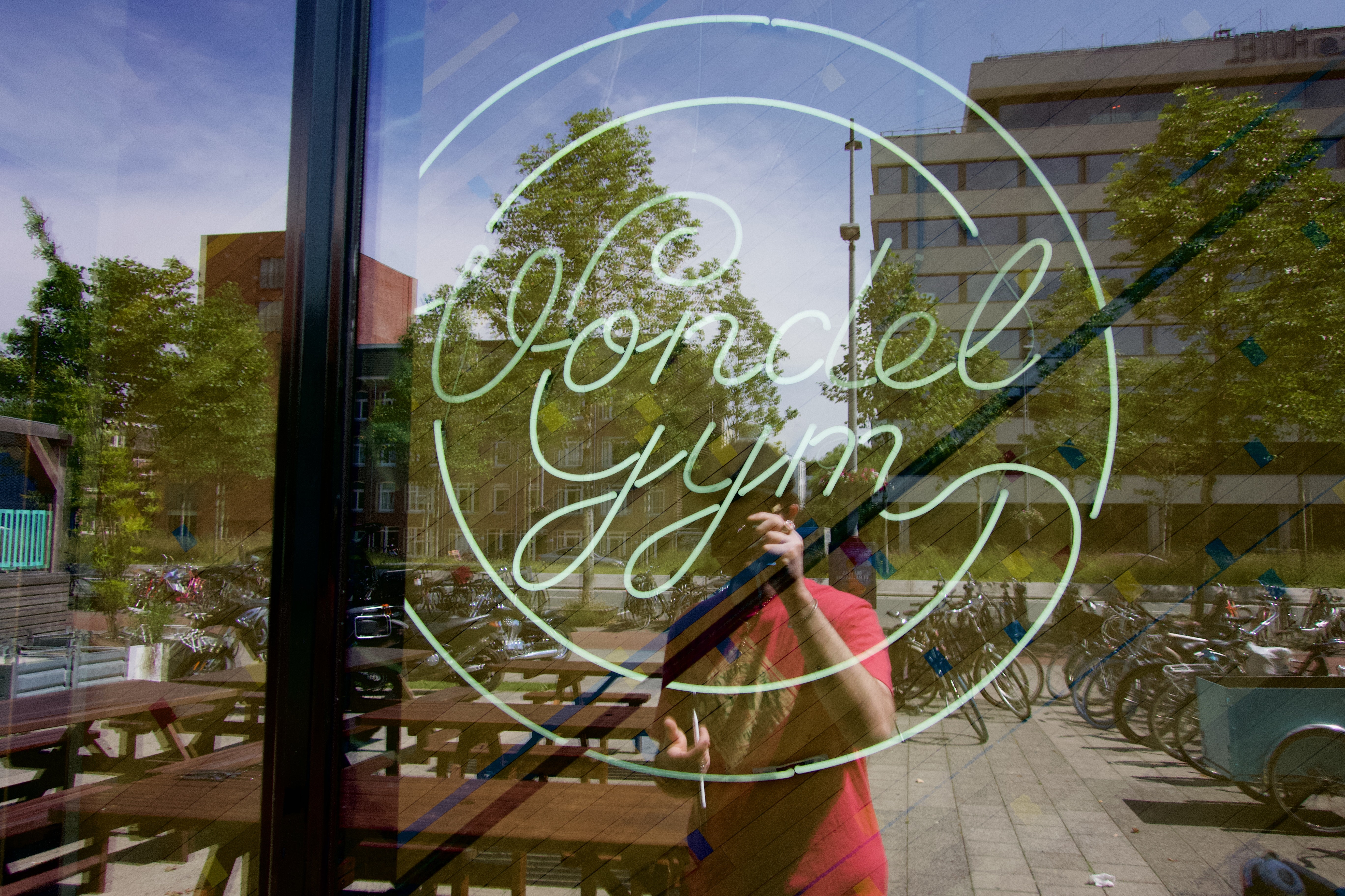 The photograph captures a playful reflection of the 'Vondel Gym' sign on a glass window, surrounded by vibrant greenery and urban architecture. The lighting is bright and natural, suggesting a lively atmosphere, while the composition creatively merges the bustling environment with the sleek gym branding. An individual, partially visible, adds a human touch to this snapshot of daily life, enhancing the dynamic feel of the scene.