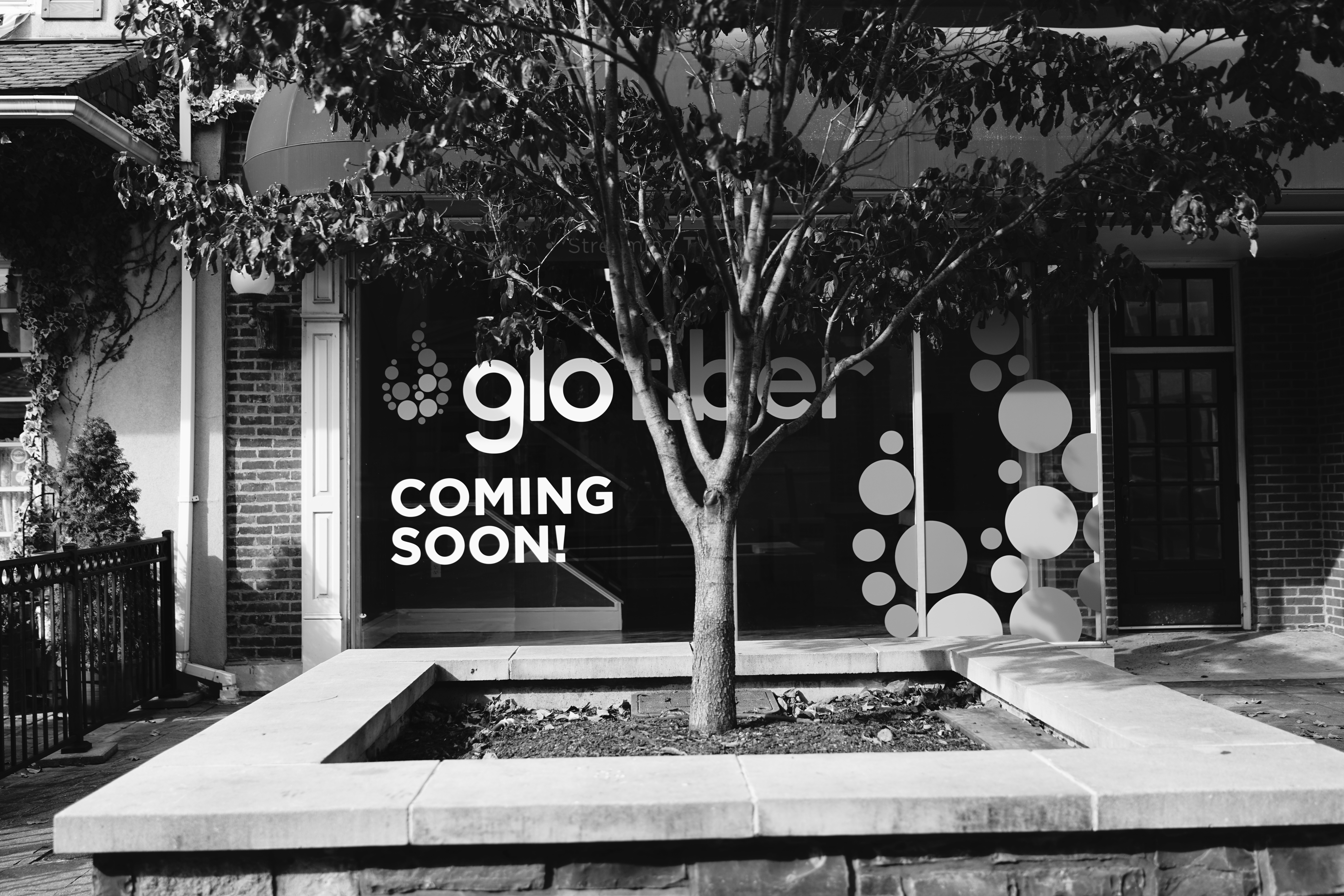 This photograph captures a modern storefront with a large, bold sign announcing 'Coming Soon!' in stark white against a dark background. A solitary tree stands in the foreground, framed by a clean stone border, creating a sense of anticipation and calm. The monochromatic tone adds a contemplative mood, highlighting the juxtaposition of nature and urban development.