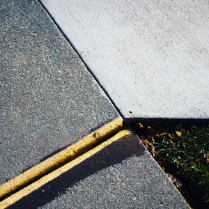 This photograph captures an intriguing intersection of concrete surfaces, framed by the sharp angles of sidewalk edges. The interplay of textures, from rough gray concrete to smooth white, combined with a dash of yellow paint, creates a stark contrast that draws the eye. Soft, natural light enhances the mood, lending a subtle warmth to the otherwise urban composition.