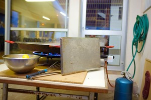 This photograph captures a bustling kitchen scene, where a metallic cooking surface emits faint heat beneath a large pan. The warm, inviting glow contrasts with the cool, muted tones of the surrounding space, evoking a sense of anticipation and vibrant culinary creation. Everyday utensils, like a whisk and a bowl of lemons, add an organic touch to the composition, grounding the image in the art of cooking.