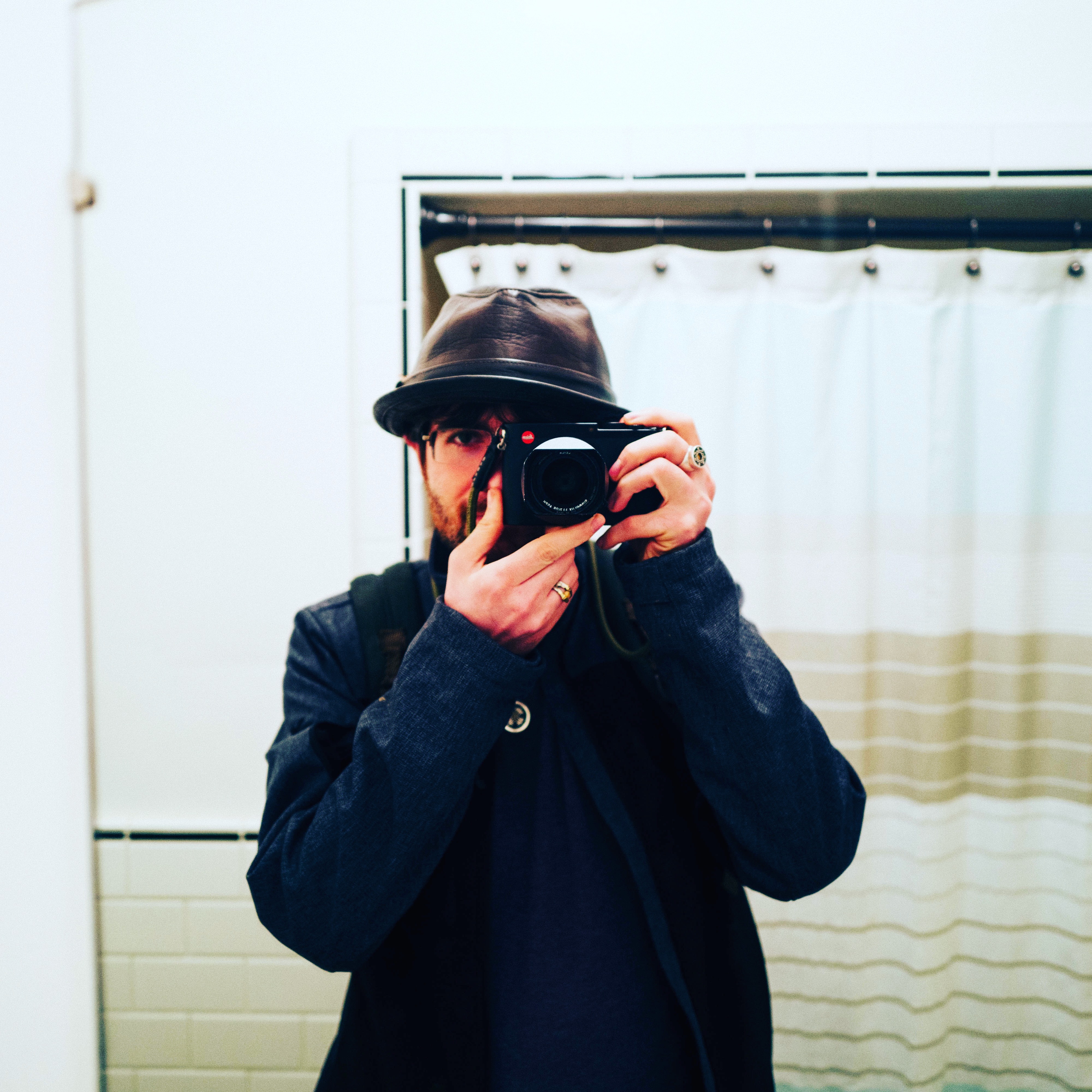 The photograph captures a man in a mirror, his composed demeanor hinting at an introspective moment. He wears a stylish hat and grips a camera, suggesting a passion for photography. The bright, minimalist bathroom setting contrasts with the deep colors of his attire, creating an inviting yet contemplative atmosphere.