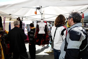 Amidst a vibrant market scene, figures pause to examine clothing displayed under a canopy. The lighting captures a lively ambiance, highlighting colorful fabrics and the casual interactions of passersby. The composition draws the viewer's eye towards the central mannequin, suggesting a sense of curiosity and exploration.