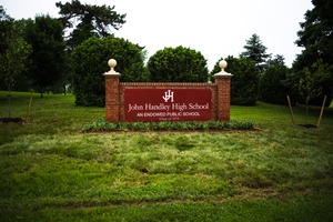 The photograph captures the welcoming sign of John Handley High School, prominently displayed against a backdrop of lush greenery. The soft morning light enhances the rich colors of the sign, creating an inviting and nostalgic atmosphere, while the neatly manicured lawn reflects pride and attention to detail. The composition emphasizes the school’s stature within its peaceful, academic surroundings, highlighting a sense of heritage and community.