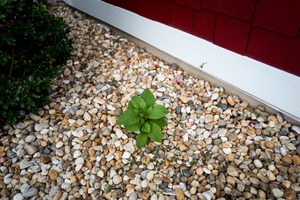 A solitary green plant emerges defiantly from a bed of smooth pebbles, contrasting vividly against the neutral tones of its rocky surroundings. The composition highlights the struggle for life and renewal amidst an otherwise barren landscape, evoking a sense of determination. Soft natural light casts gentle shadows, enhancing the plant’s vibrant leaves and the textured stones, creating a peaceful yet powerful atmosphere.