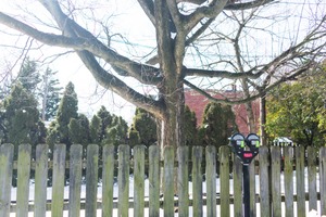 A skeletal tree reaches out from behind a rustic wooden fence, its barren branches stretching toward a bright blue sky. Soft sunlight filters through the branches, illuminating patches of snow on the ground, while a nearby parking meter stands as a lone sentinel in this tranquil winter landscape. The mood is calm, evoking a sense of stillness and simplicity in a moment captured in early winter.
