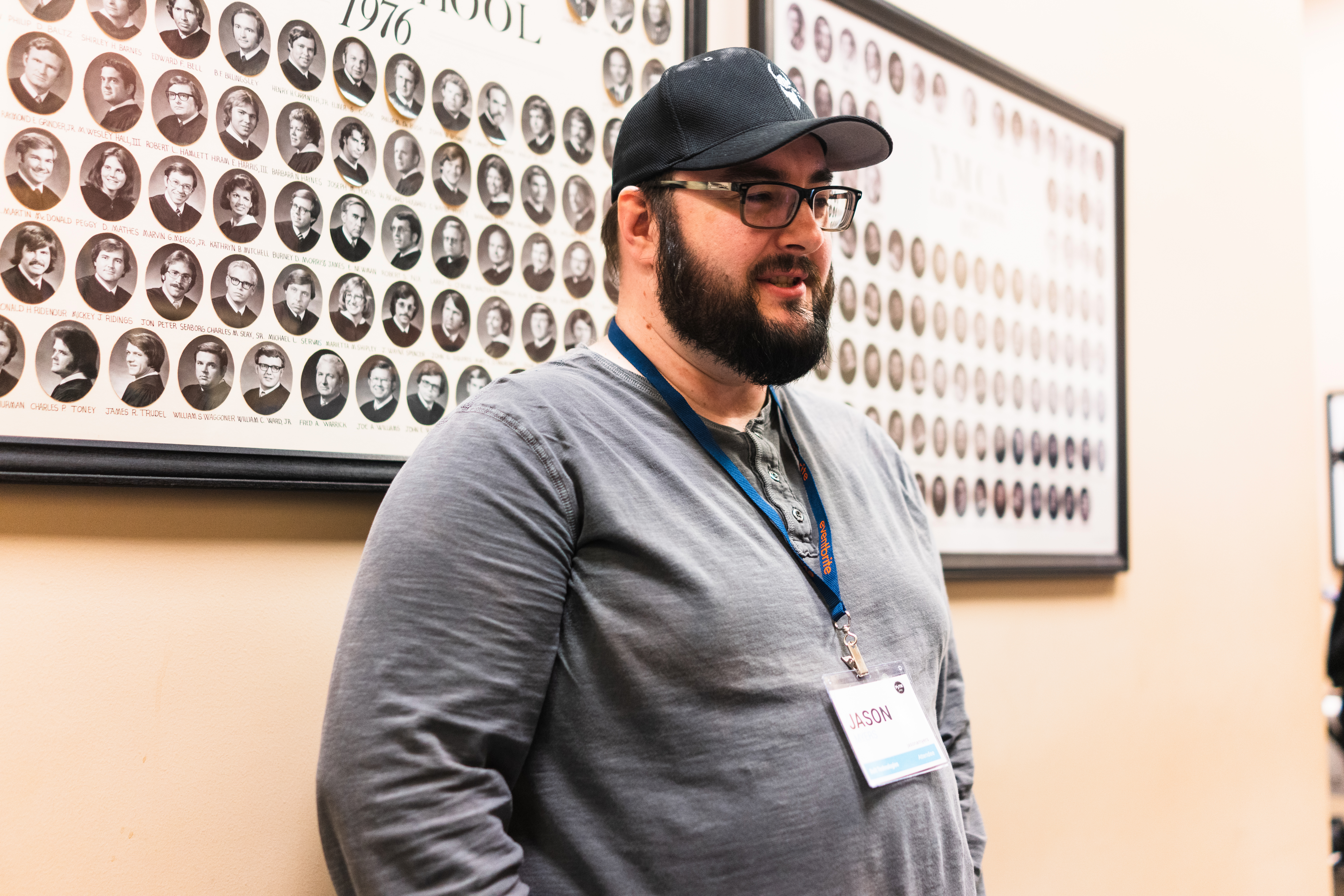 The photograph captures a man standing pensively against a backdrop of vintage black-and-white portraits, evoking a sense of nostalgia and reflection. The warm ambient lighting softly highlights his features, creating an intimate atmosphere, while his casual attire contrasts with the formal portraits around him. His expression suggests a contemplation of past connections as he remains connected to an earlier time.