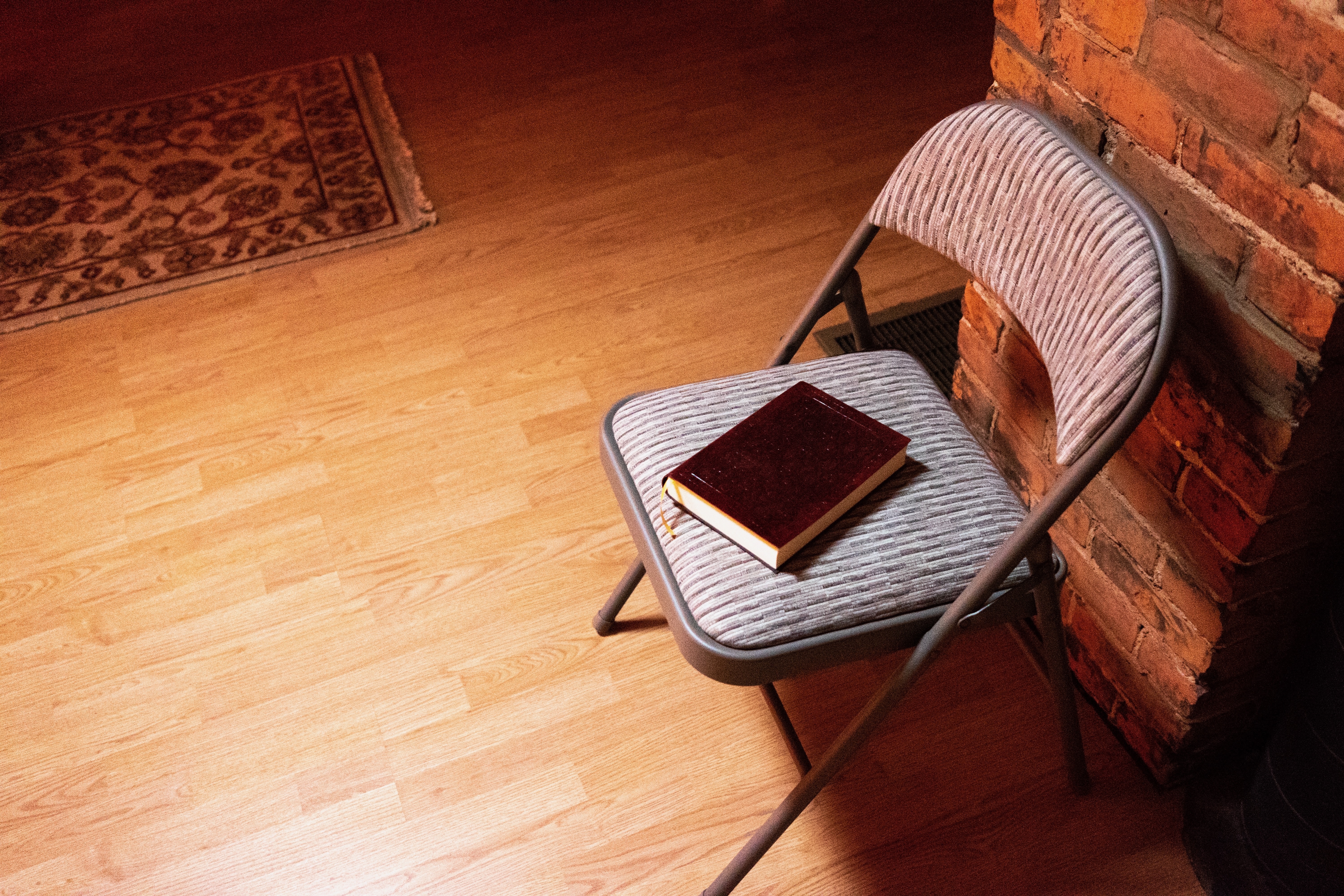 A solitary folding chair sits against a rustic brick wall, holding a closed book atop its lightly striped cushion. Warm, muted lighting envelops the scene, casting gentle shadows that evoke a sense of quiet reflection and introspection. The textured patterns of the chair and surrounding elements create a harmonious composition that invites contemplation.