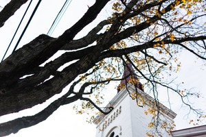 The photograph captures a striking juxtaposition of a gnarled tree branch against the backdrop of a historic church steeple. Soft, diffused light illuminates the scene, enhancing the warm autumn hues of the leaves while creating a tranquil and contemplative mood. The composition draws the eye upward, intertwining natural and architectural forms, evoking a sense of harmony in the urban landscape.