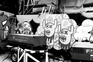 This black-and-white photograph captures a vibrant wall of graffiti art featuring colorful, cartoonish characters, juxtaposed against the industrial backdrop of construction equipment and scaffolding. The mood is playful yet gritty, highlighting the clash between artistic expression and urban decay. Soft light casts intriguing shadows, enhancing the details of the artwork while framing the bustling environment around it.