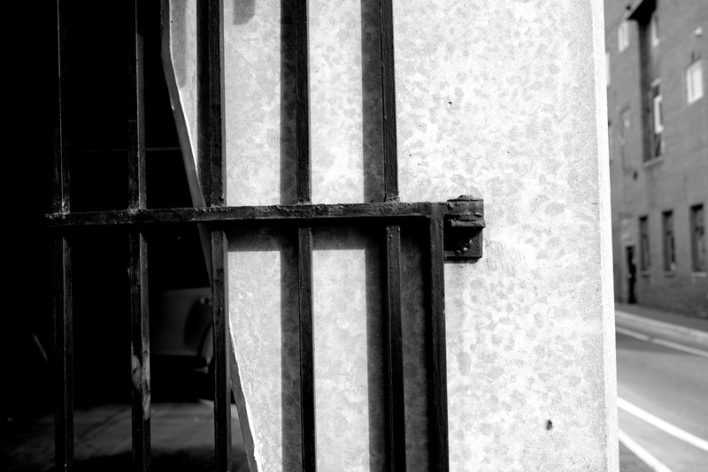 A stark black-and-white image capturing the interplay of light and shadow through iron bars against a textured wall. The composition draws the viewer's eye through the contrasting elements, evoking a sense of confinement and urban solitude. Soft light illuminates the edges of the bars, enhancing the bleak yet intriguing mood of the scene.