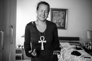 In this poignant black-and-white photograph, a woman stands in a dimly lit room, her expression a raw blend of pain and reflection as she clutches a beaded necklace. The soft light accentuates her emotional state, creating an intimate atmosphere that draws the viewer into her experience. The simple, cluttered background enhances the focus on her struggle, evoking a sense of both isolation and resilience.