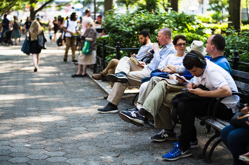 In a vibrant park scene, a diverse group of individuals sits on benches, absorbed in their own worlds yet sharing a common space. The warm, dappled sunlight filters through the trees, casting soft shadows and enhancing the relaxed atmosphere. The juxtaposition of solitude and community evokes a sense of both connection and introspection among the passersby and seated figures.