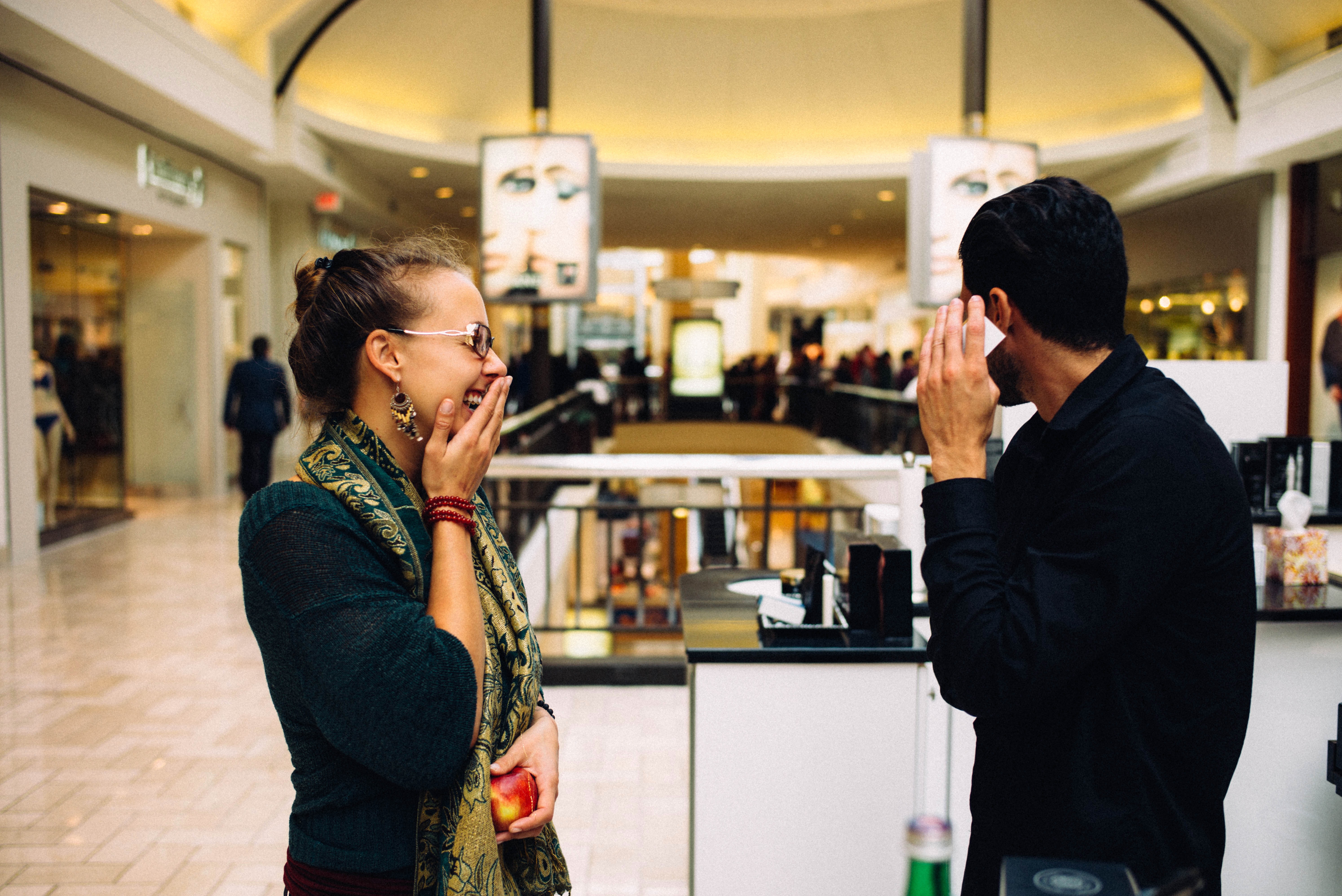 The photograph captures an intimate moment between two figures in a bustling mall, where the woman is playfully covering her mouth while gazing at her companion. The soft lighting enhances the ambience, creating a warm, inviting atmosphere, while their expressions convey a sense of shared joy and connection amidst the crowd. The composition features clean lines and a focus on the subjects, contrasting with the busy background for an engaging visual narrative.