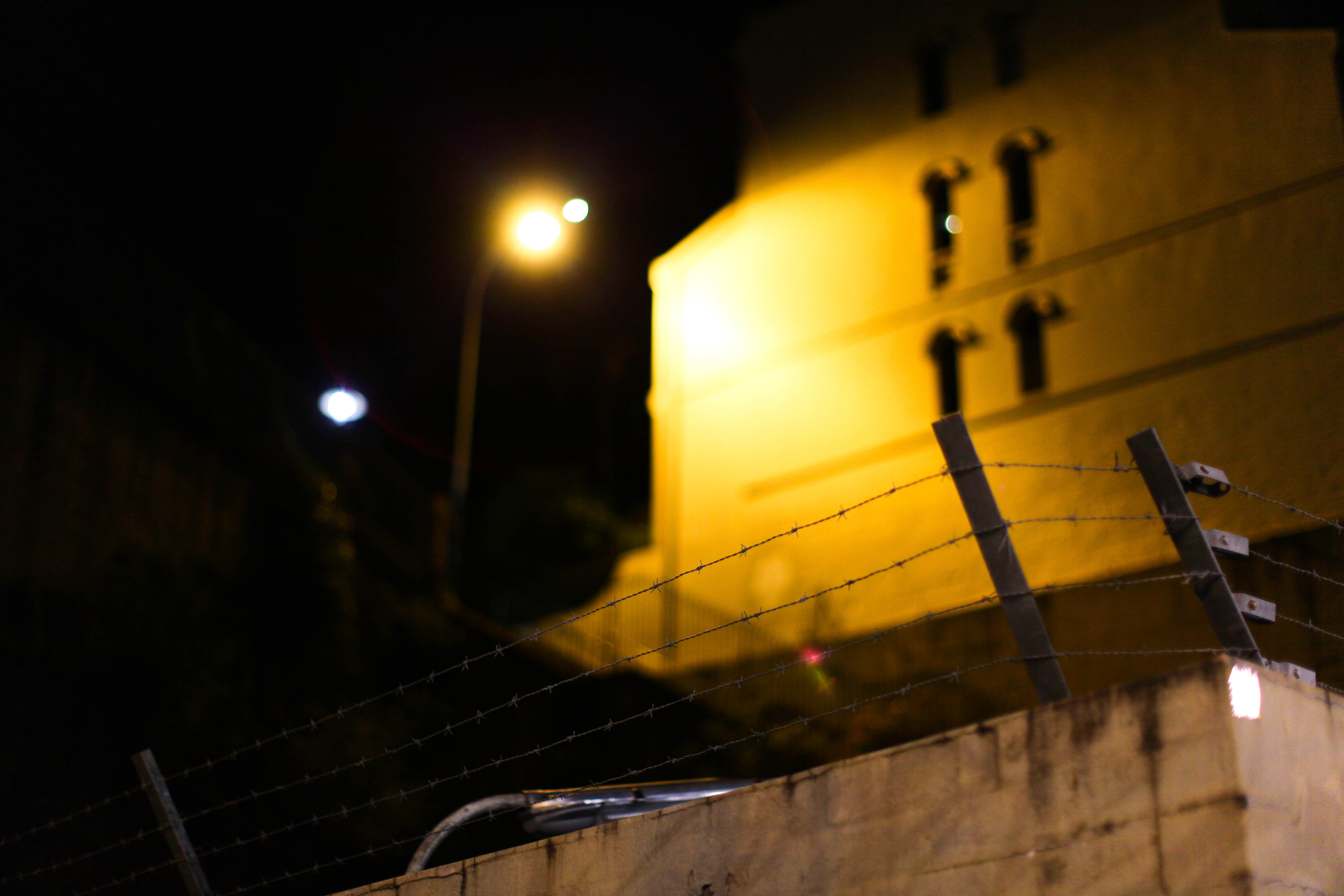 In the stillness of night, a low wall topped with barbed wire frames the scene, directing attention to a softly illuminated building above. The warm glow of streetlights casts an eerie contrast against the dark backdrop, evoking a sense of unease and mystery. The blurred foreground enhances the isolation, creating a haunting atmosphere that invites contemplation of what lies beyond the barrier.