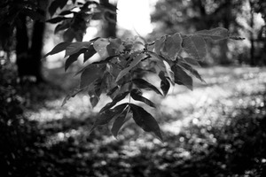 In this serene black and white photograph, a branch adorned with delicate leaves emerges as the focal point against a softly blurred background of trees and dappled light. The interplay of light and shadow creates a tranquil atmosphere, evoking a sense of calm and introspection. The sharp details of the leaves contrast beautifully with the hazy backdrop, inviting the viewer to appreciate the quiet beauty of nature.